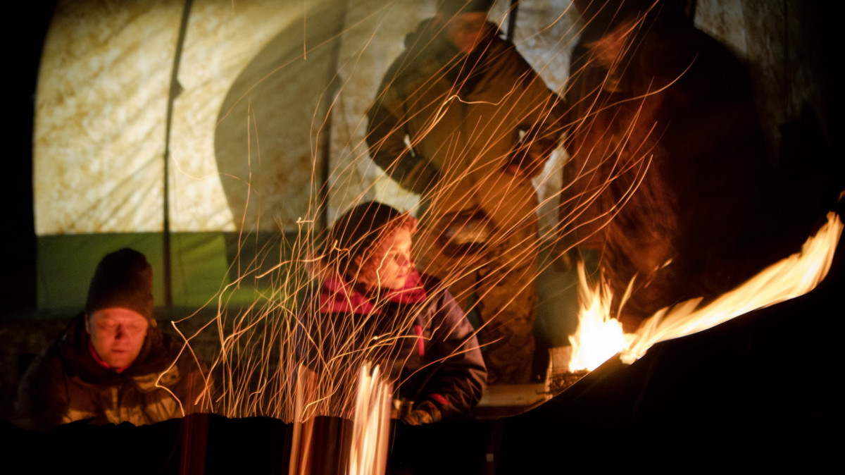 В затоке стоячая вода, которую успел сковать лед миллиметров в 15. Это было очень своеобразное движение. Лодка пробирается среди плавающих кусочков льда, а лопасти скребут по ледяному зеркалу. Большинство проделало это в свете налобных фонарей.