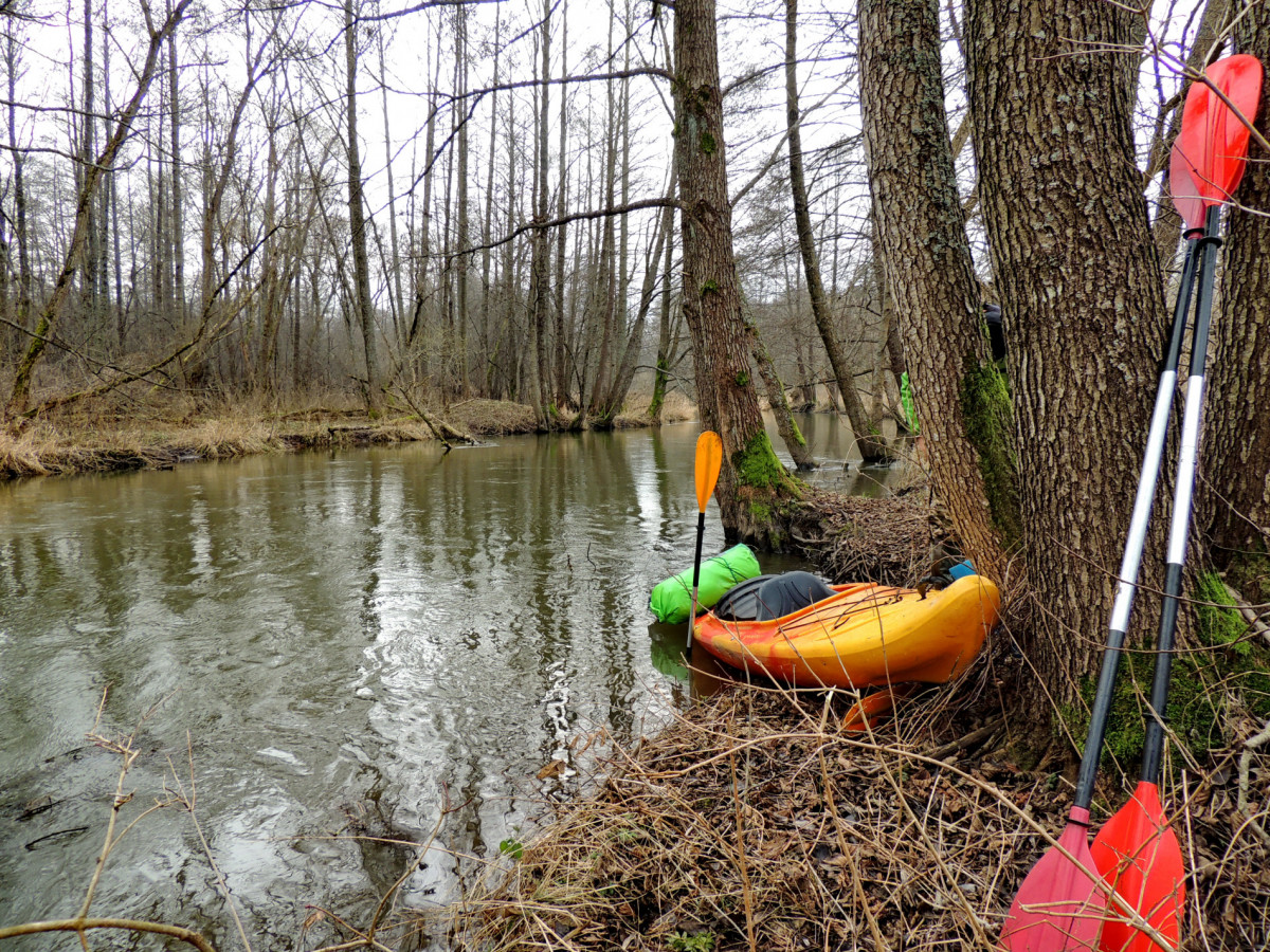 А стояли мы по итогу в левобережной долгой подковообразной затоке. Местные её именуют Черным Озером. Чтобы подъехать к выходу на берег из русла реки по затоке пришлось побираться через узкий фарватер, пробитый пластмассовыми байдарками.