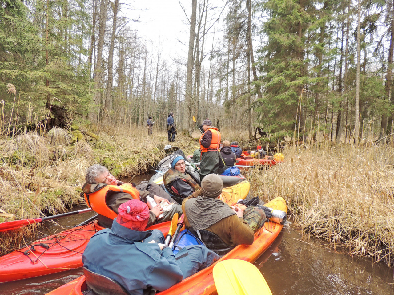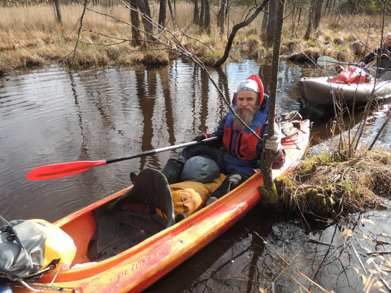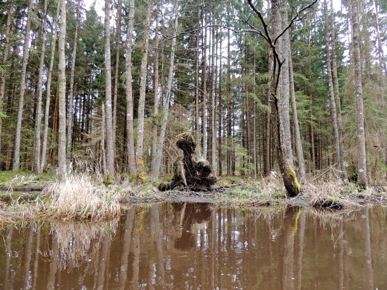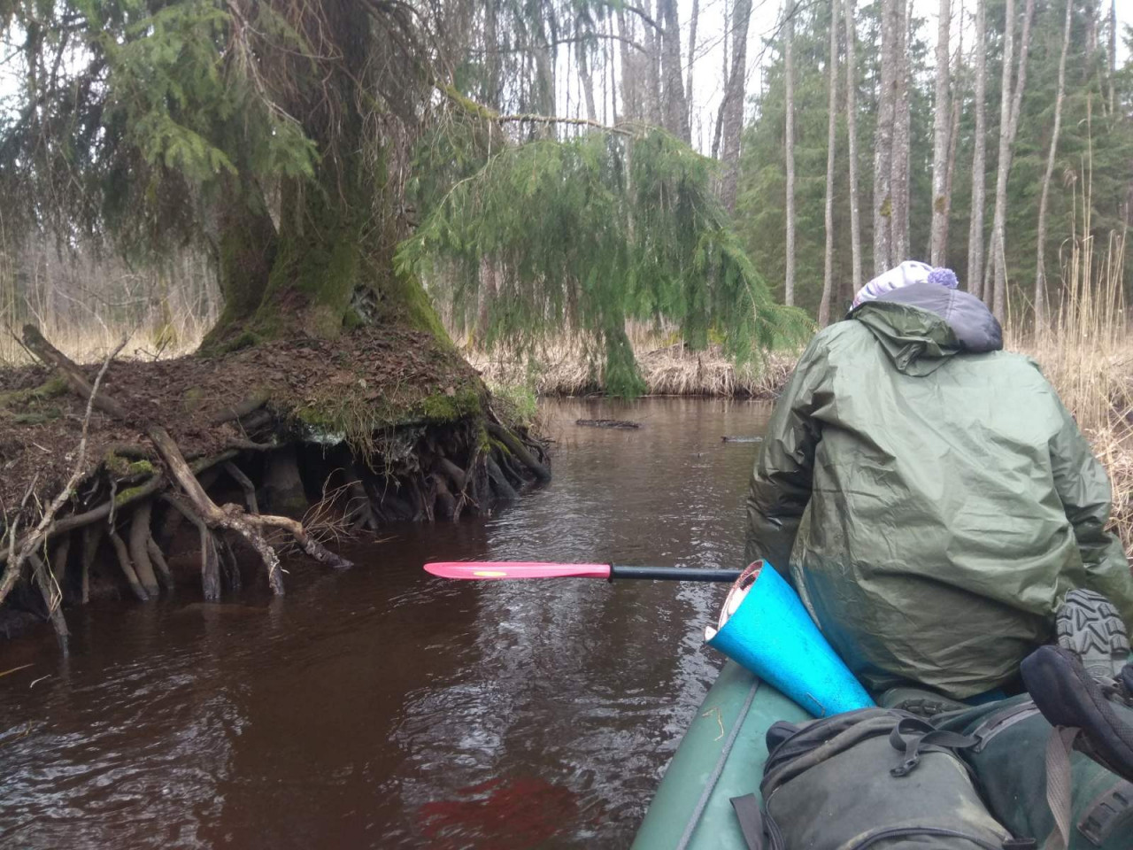 Атмосферно было и восхитительно в этом болотном лесу. Мы сроками ошиблись неделю или несколько недель. Согласно отчетам, с русла можно было легко сбиться и уйти в затопленный лес. Но вода упала, и река теперь 21 марта была в берегах. От этого задача усложнялась. По обнажившейся грязи можно было судить, что вода ушла отсюда совсем недавно.