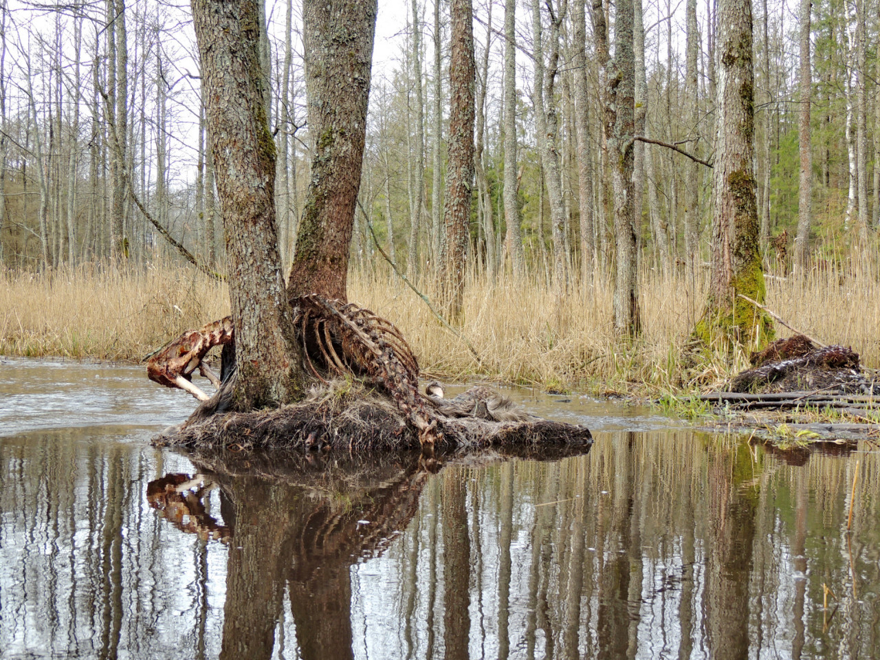 Передние конечности, лопатки, таз, бедра все это сохранилось. Скелет был обглодан. У подножия и корней остались фрагменты шерсти. Ни черепа, ни рогов не было. Огромный взрослый лось, судя по всему, хотел когда-то здесь перейти реку, выбрал зачем то путь через эту разветвляющуюся ольху и застрял в сужающемся клиновидно остром углу расщелины.
