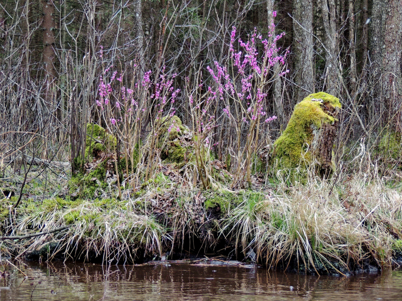 Ехали мы среди этих чешуйчатых неровных ольх, сочного и контрастно выделяющегося ельника, мой генерал. Сухие плети прошлогоднего хмеля вздымающегося на деревья в этом сумрачном лесу были эффективны. Отдельные обрубки погибших деревьев придавали атмосфере таинственность. Местами попадались удивительные здесь в лесу для марта сиреневые цветочки.