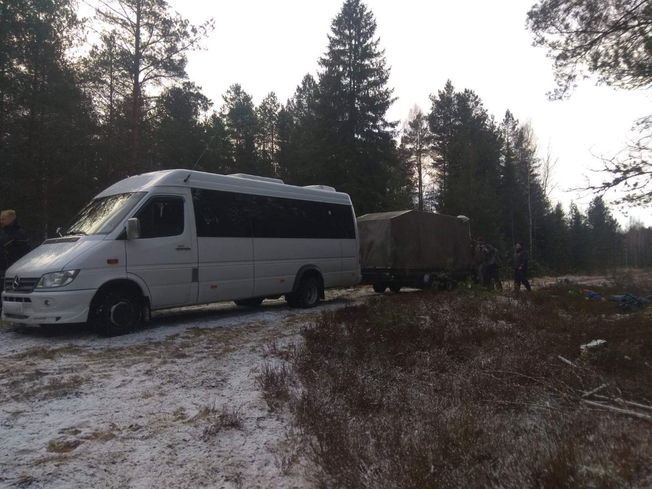 Инфантерия из двух десятков человек шествующая по-утреннему лесному грейдеру при абсолютной удивительно тишине и безветрии под идущим хлопьями снегом. Белейший бус с громадным двухосным прицепом завяз, да так основательно, что выбраться даже враскачку не помогало. Суммарно у нас было много силы. Мужская компания. Многие грузные и дюжие. Если Спринтер не вынесли на руках, то потребовалось человек шесть, чтобы вытолкнуть его со свистом.