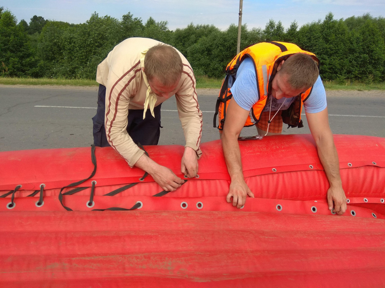 Рафты сбирали на обочине дороги перед мостом через впадающую здесь в Свислочь Титовку. На ровной поверхности было весьма удобно. Эти мастодонты нужно кроме того что надуть, так еще и зашнуровать дно. Сделали все довольно оперативно и дружно.
