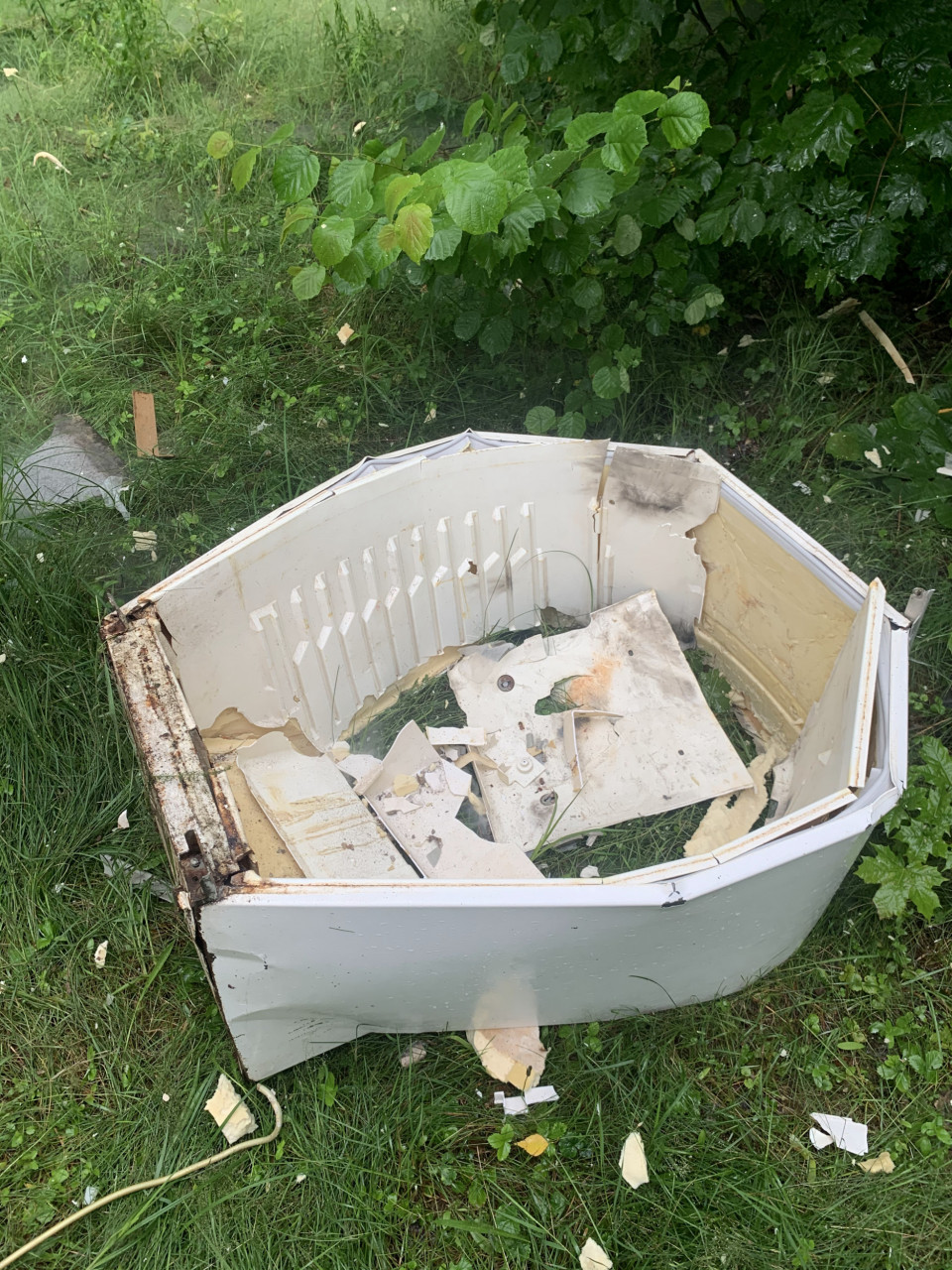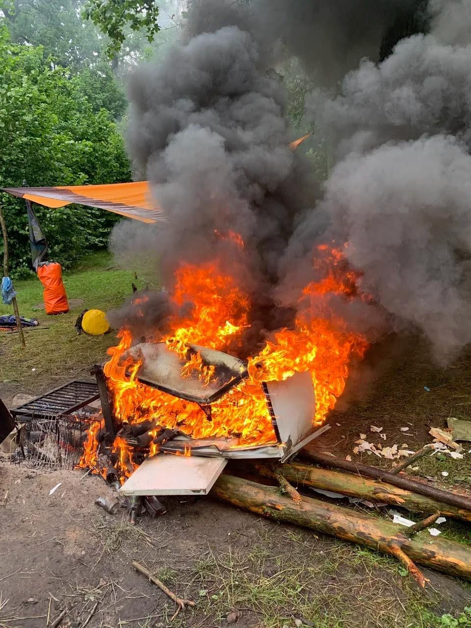Однако, это было еще не все. Овации дальше были гораздо значительнее. Настоящая Грета Тунберг меня бы за эту пиротехнику просто растерзала. На поляну был заблаговременно доставлен еще и замечательный холодильник «Минск 11» (Глаз придумал). Можете меня застрелить, но что-нибудь взорвать – обожают большинство не только детей, но и взрослых. Причем, чем мощнее, тем лучше. Холодильник был установлен с краю поляны, предусмотрительно подальше от палаток, но и не совсем на задворках. Подле подковообразно огибающих край поляны кустов лещины.