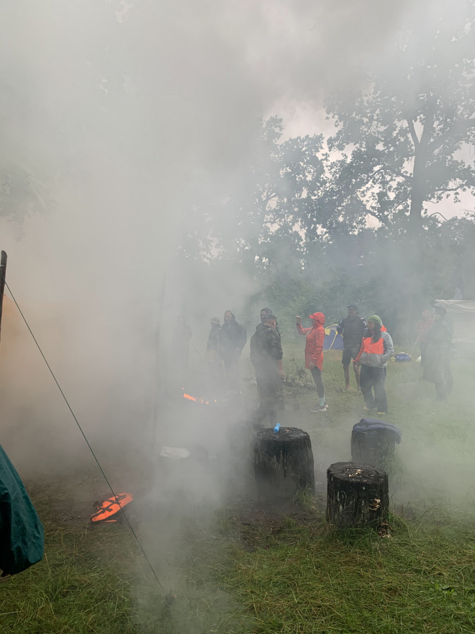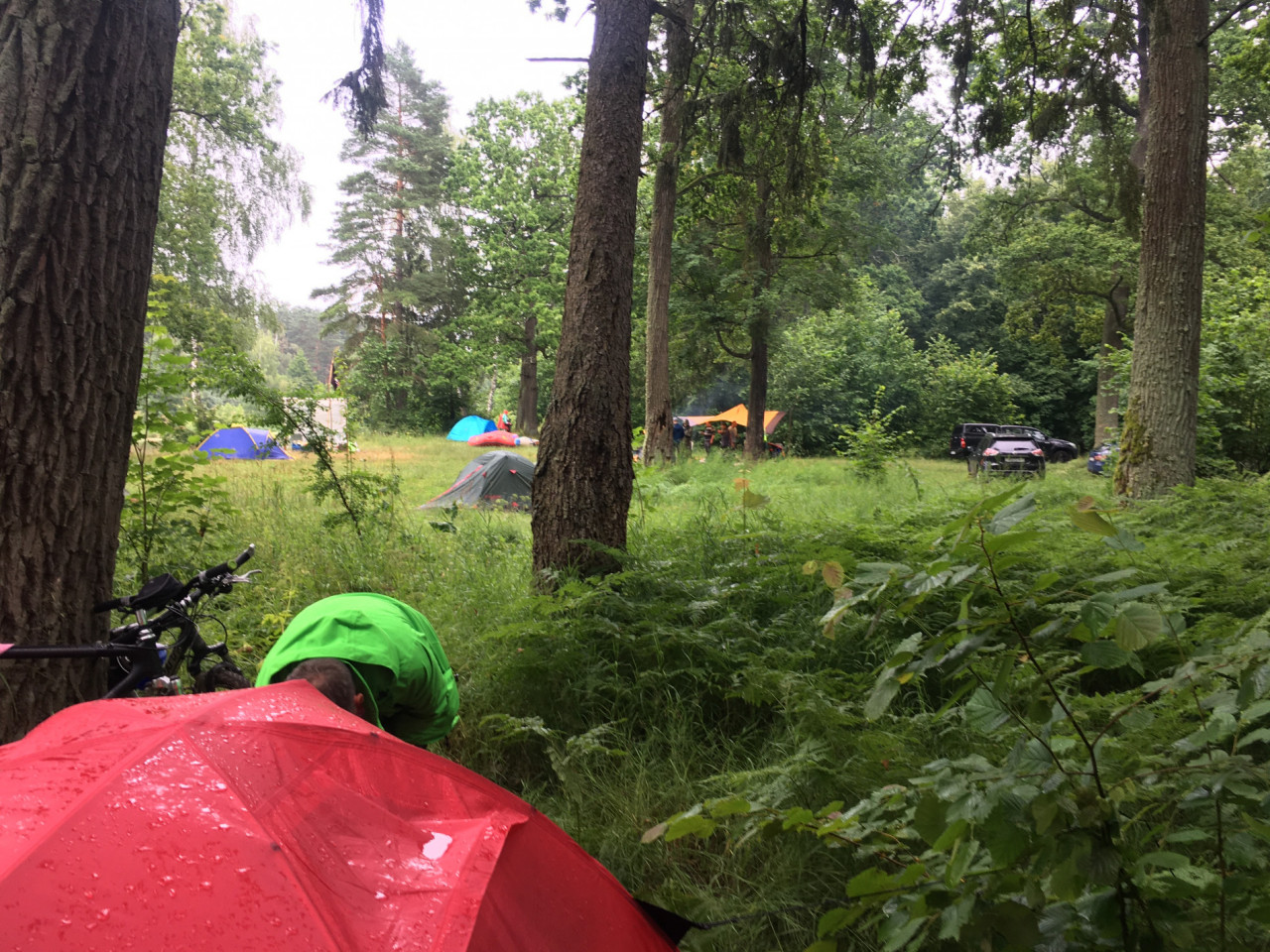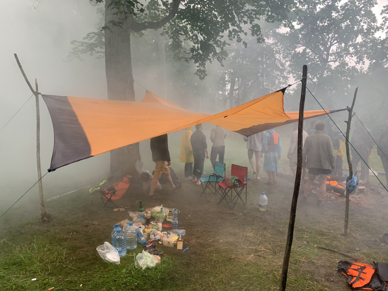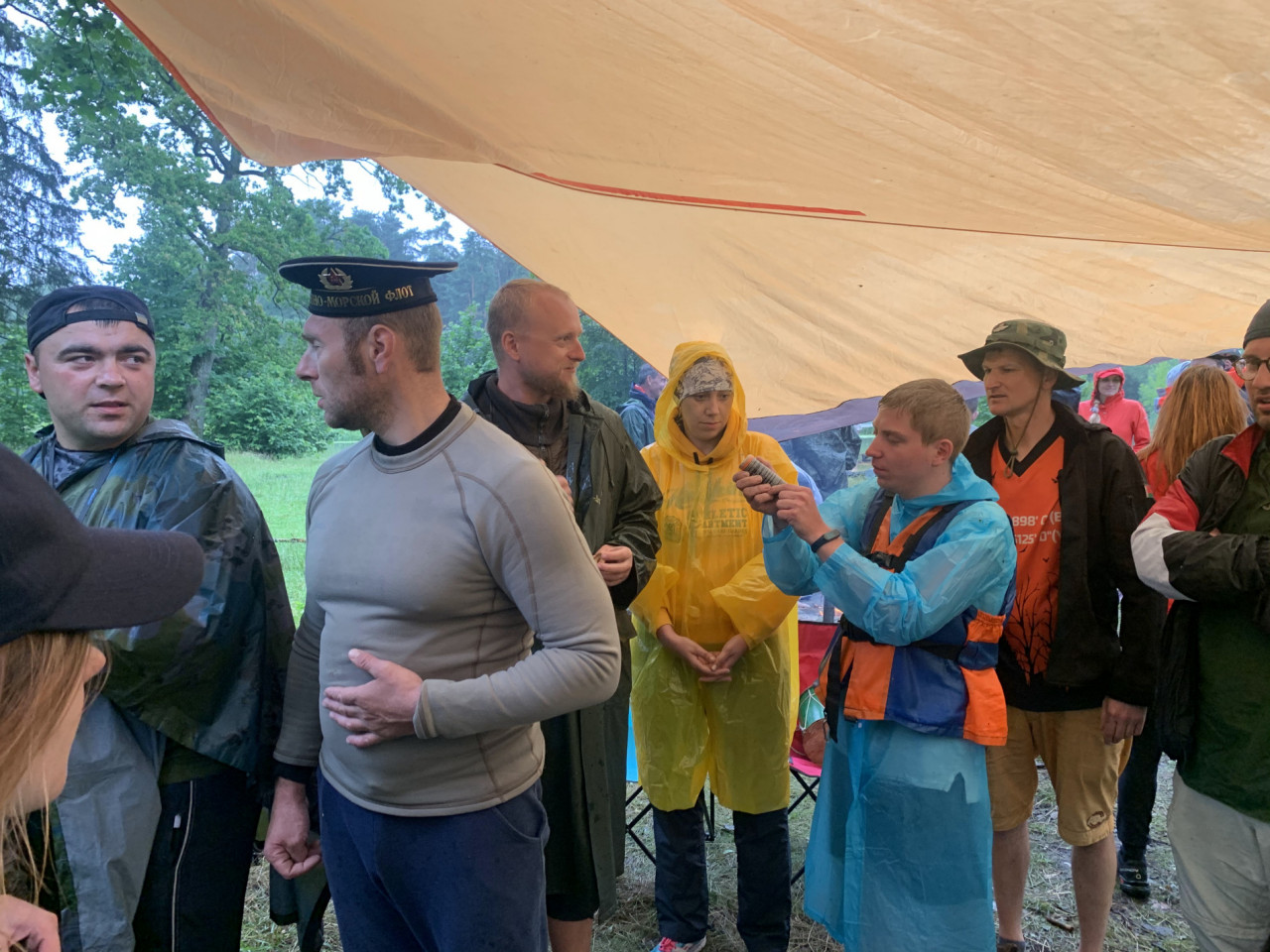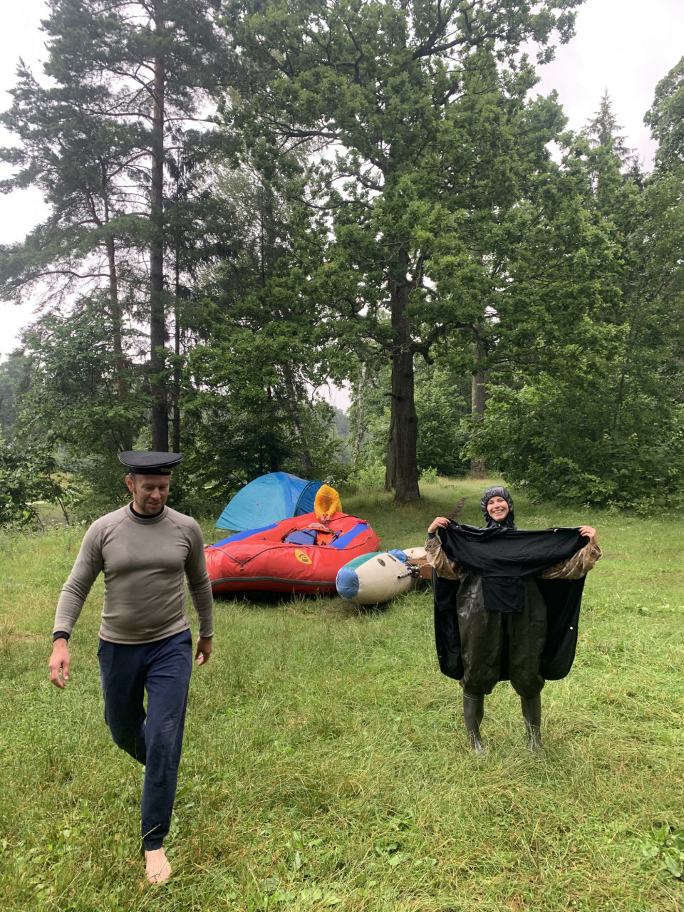 Утро 12 июля выдалось ненастным. Вечером и ночью вчера сверкали зарницы. Дождевой фронт к утру сюда притянуло. Утро воскресенья вплоть до обеда встретило нас бронебойным дождем. Из палаток вылазили не синхронно и лениво раскачиваясь. Велосипедисты уехали. Два человека из вело группы дезертировали. Одного поднять не смогли, другого (Роман Монахов) определили на борт рафта «Имени Мощного» причем с велосипедом.