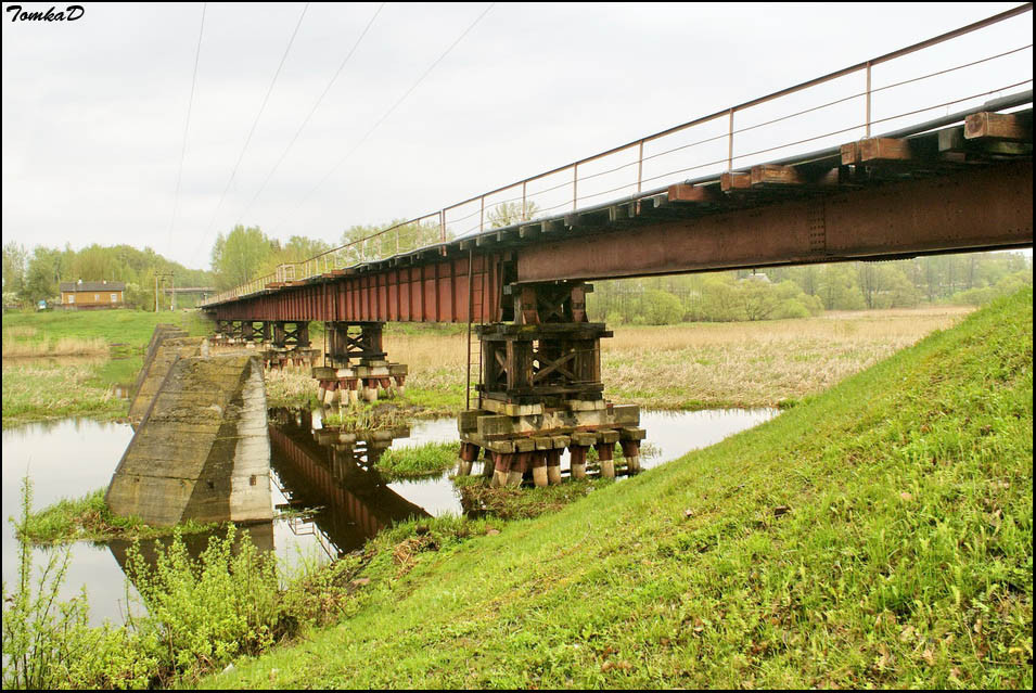 Виталик был или трезвый или не сильно пьяный. Застегнули карабин за задний поперечный элемент рамы. Поехали уверенно. Пятисильный мотор вполне сноровисто двигал сплотку. Виталик правил правой рукой. Ветра не было. Проехали автодорожный мост (М5). Потом деревянный, единственный такой в Беларуси железнодорожный. Уникальнейшее инженерное сооружение. Его не сфоткали. Поэтому приведу фотографию из сети.