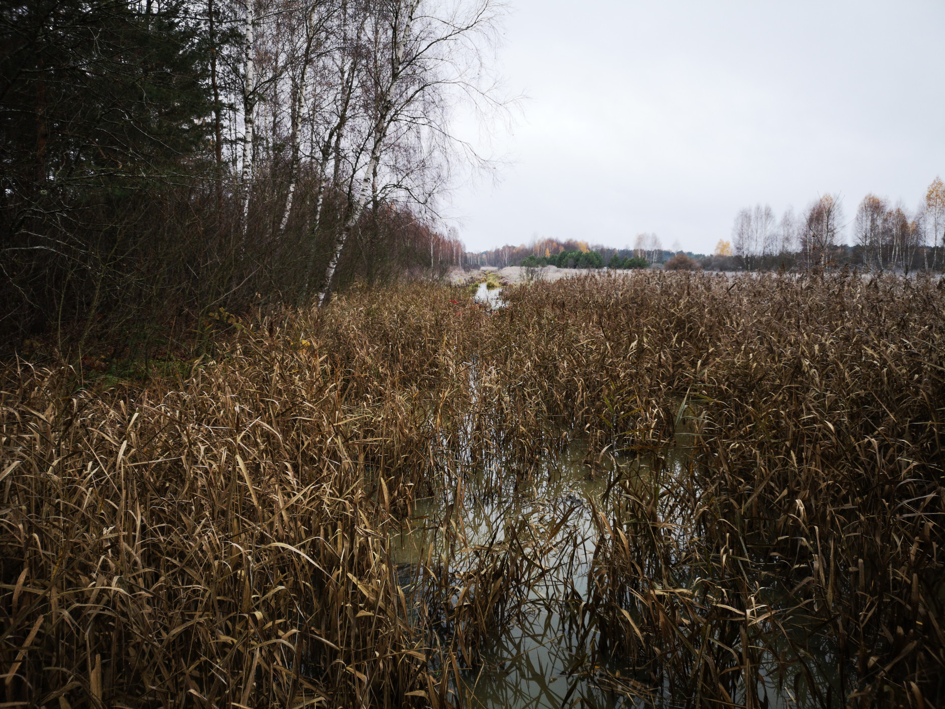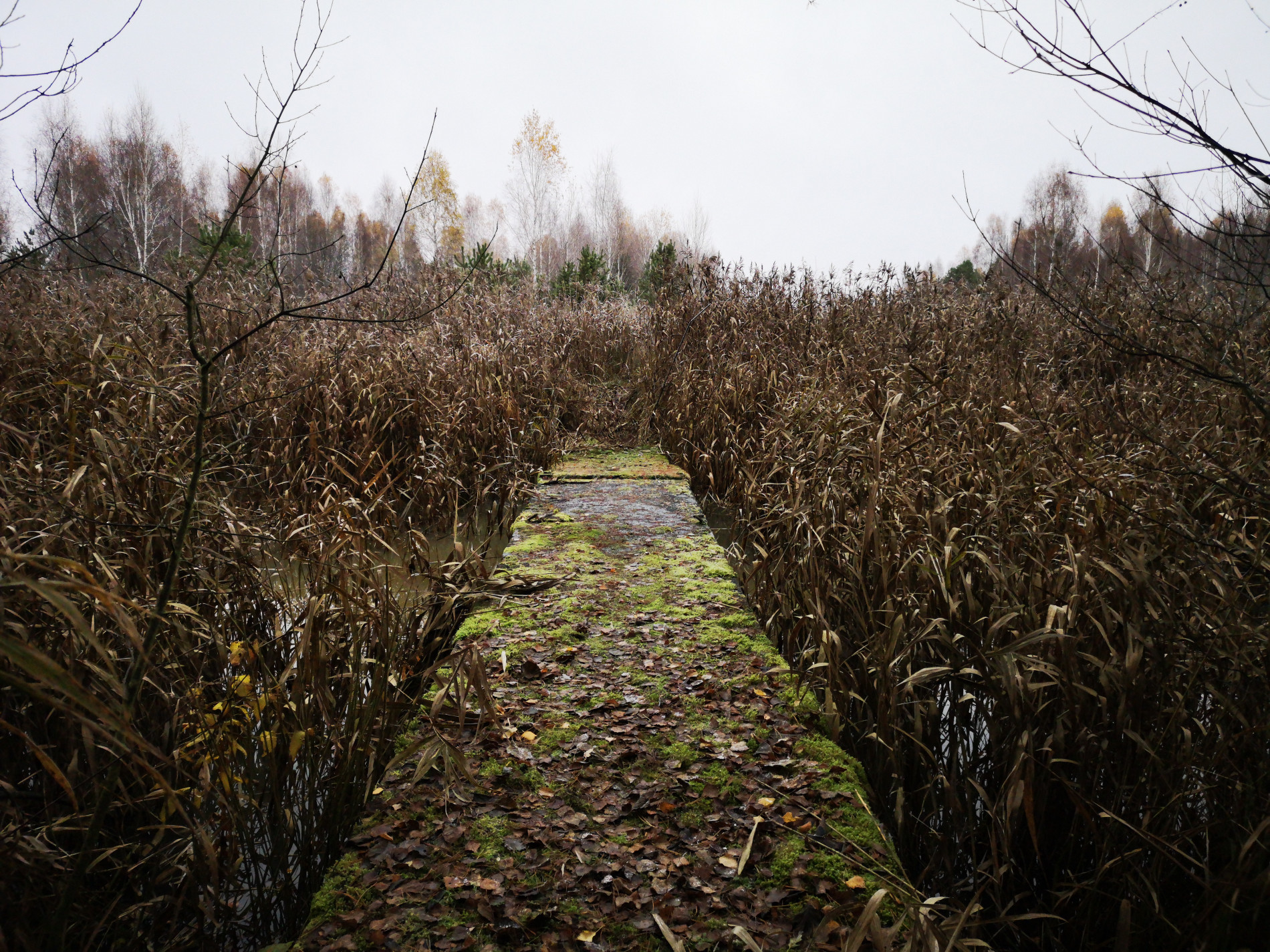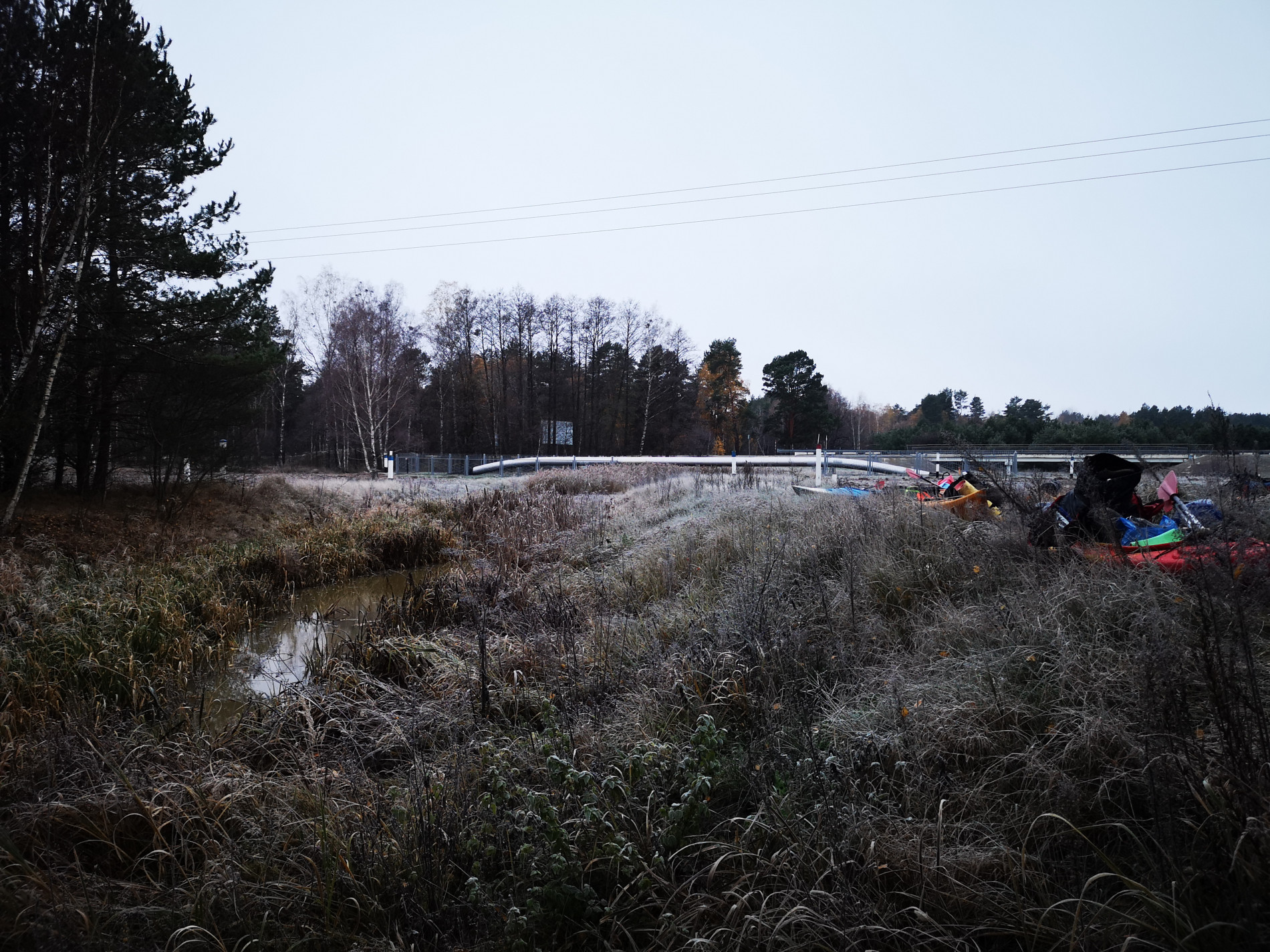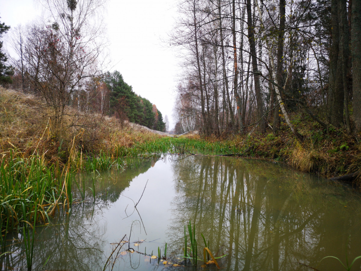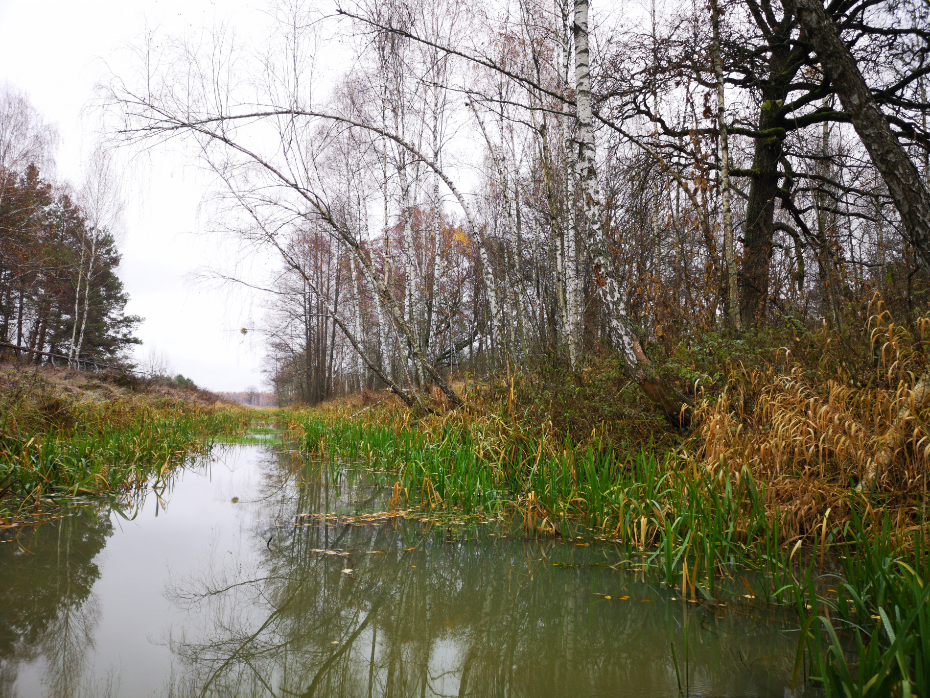 Подобраться к Словечне еще и в обход украинской территории можно и нужно по каналу. Канал почти прямой. Течет он на восток. Поначалу совсем узок, но постепенно слева набирает воды из вливающихся притоков. Воды было сегодня не меньше чем летом и какого-то она очень странного болезненного миазменного цвета.