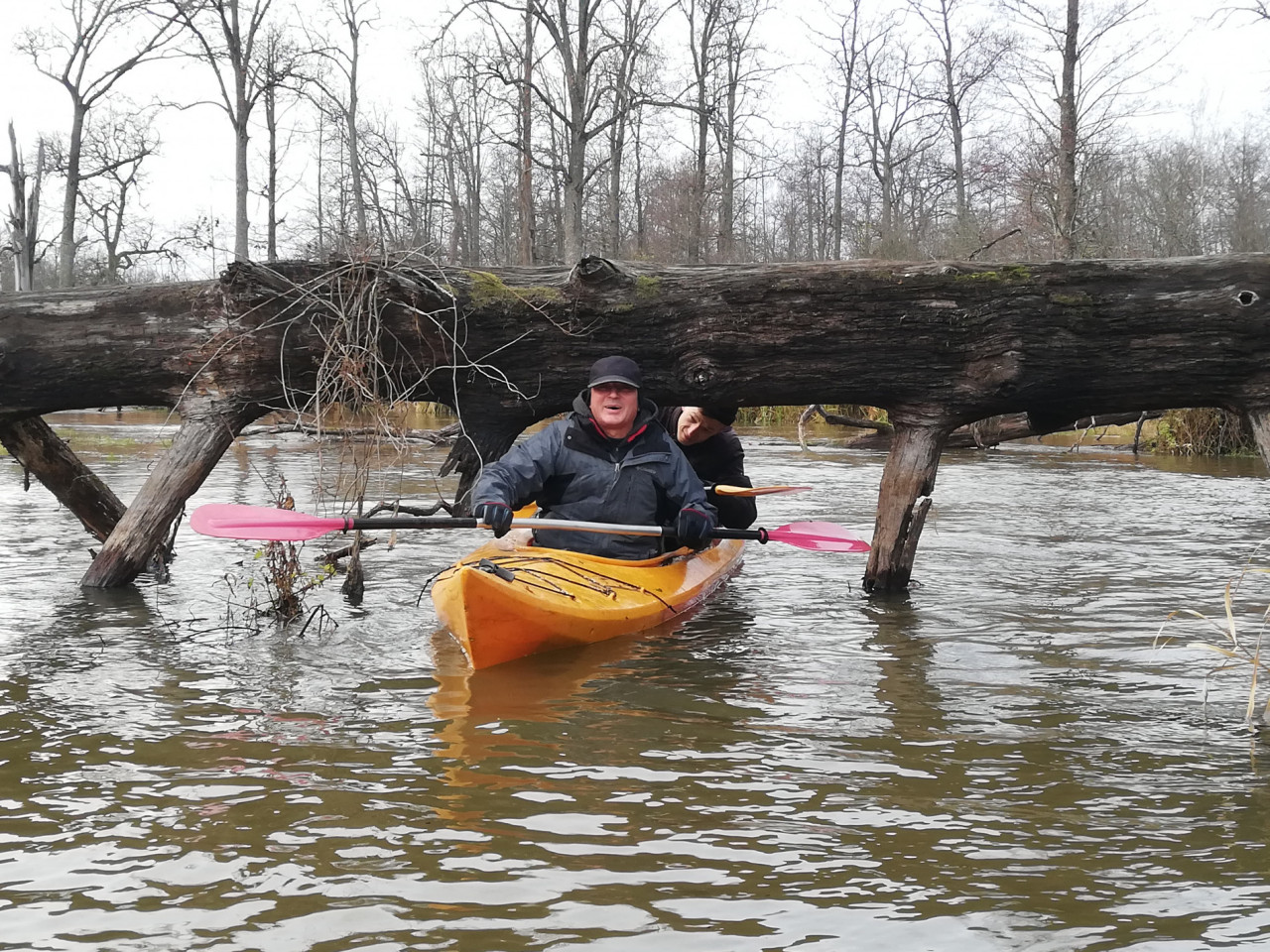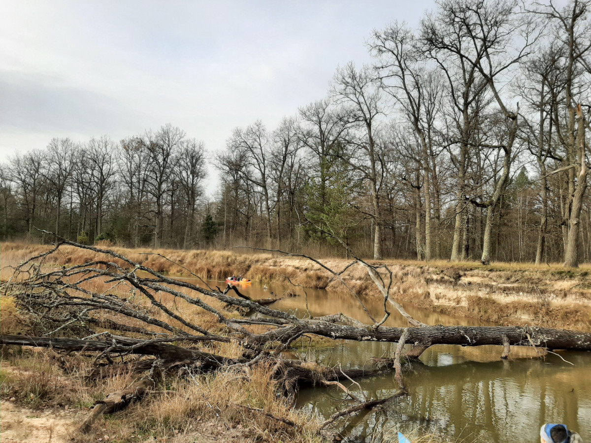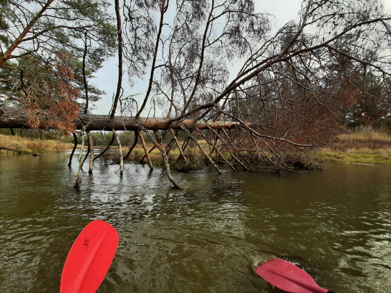 Долго мы сражались с корягами. Не скучно. Каждый квест был хитроумнее другого. Даже мне удивительным показалось, что рухнуло дерево на краю берега и перегородило всю реку. Вода между выворотнем и урезом песка промыла именно такой проход, что как раз впритирку может протиснуться байдарка.