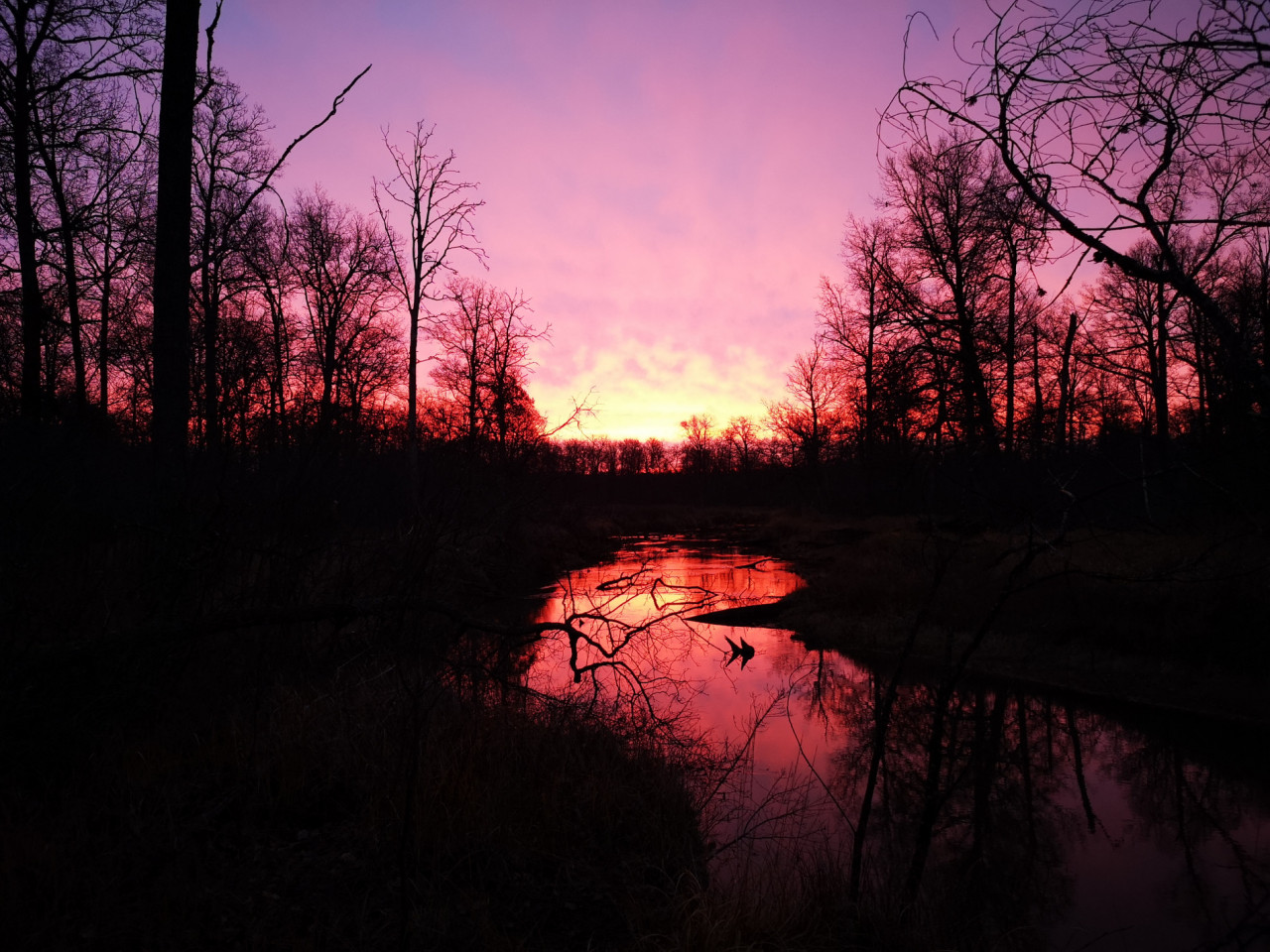 Давно я не видел столь зловещих рассветов. Такие, пожалуй, могут быть только в чернобыльской зоне. Задолго до появления мутного осеннего солнце бледнеющий горизонт на юго-востоке все интенсивнее окрашивался в редкие цвета, фиолетовый, сиреневый, розовый. Участок неба, казалось, разверзается. Легкая облачность на горизонте походила на грандиозные протуберанцы. Полный штиль и гробовая тишина. Точащие с зеркальной поверхности реки обрубки коряг в рассветной мгле выглядели еще более устрашающе и недобро.