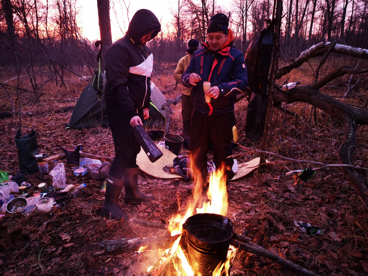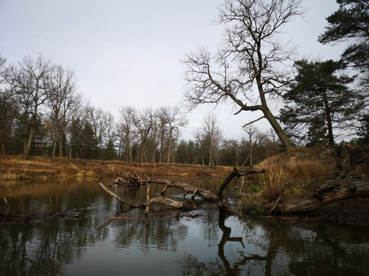 Дикие берега. Нет дорог, пляжиков, беседок. Стояли мы лагерем в редком лесу. Дуб, береза, ольха. Глаз напился и безмятежно уснул у костра. Ноябрь мой дружбан. Зябко стало в ночи. Перелез в спальник.
