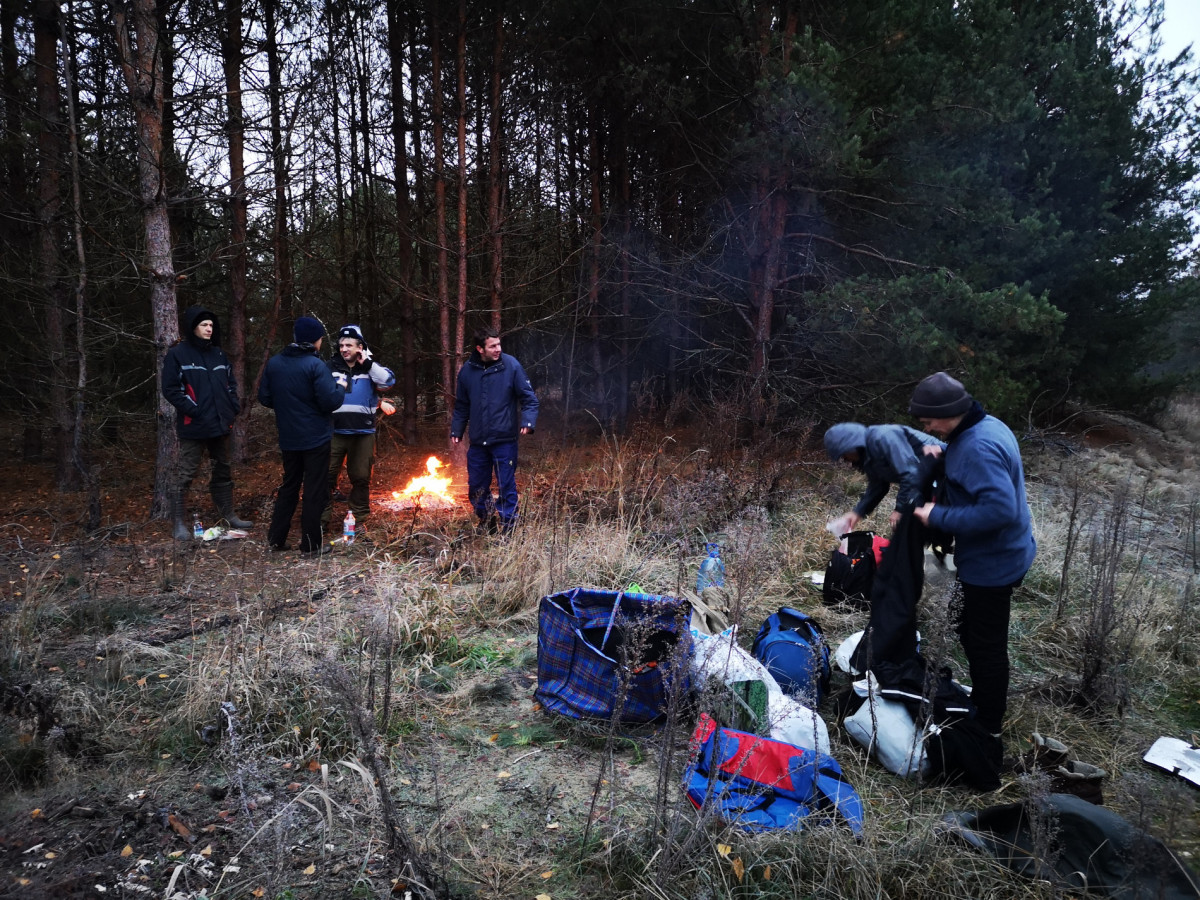 В замечательном сухом и молодом лесу разожги костер. Здесь вдоль дороги, конечно, газопровод, но отошли мы от него далеко. Костер пока ожидали возвращение из Калинковичей на такси водителей. Второй раз хочет по Словечне пойти с нами неизвестный мне человек из Брагина. Зовут его Влад и с точностью, как и в тот раз, в день старта сообщает утром, что к нему в гости без предупреждения приехала двоюродная бабушка из Удмуртии.