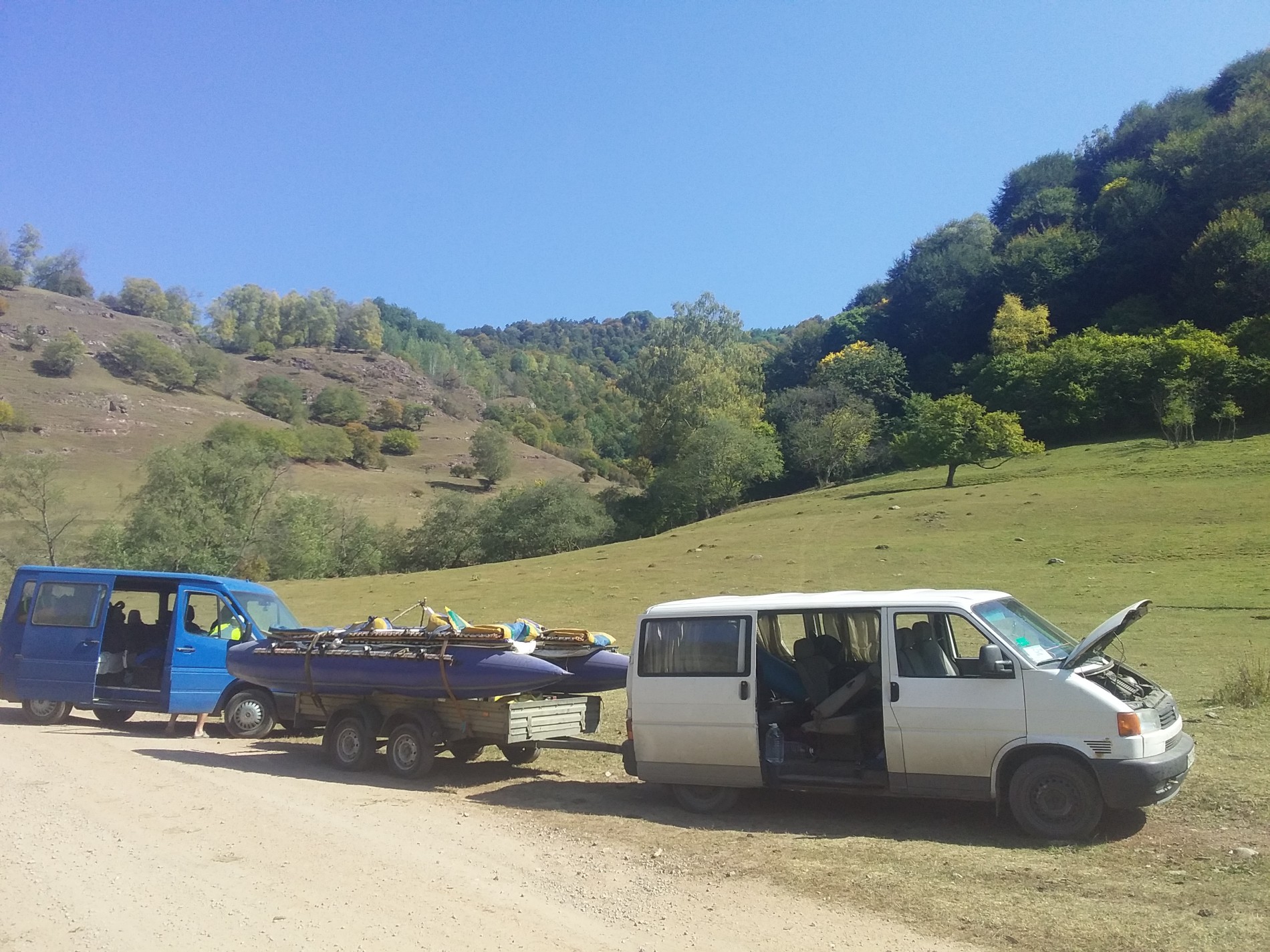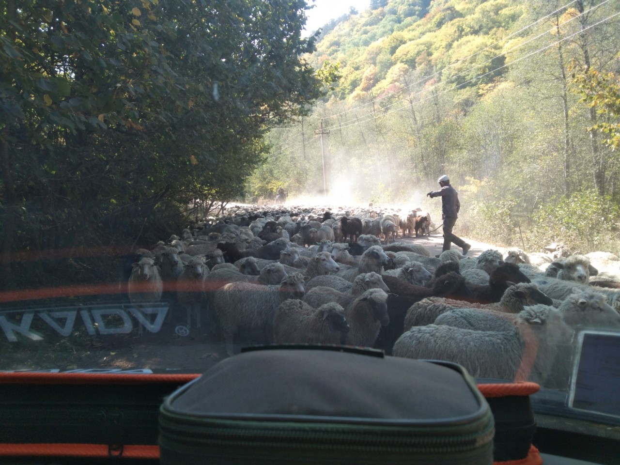 Третьей рекой нашего турнэ был Аксаут. Традиционно мы медленно поднимались вдоль реки по весьма живописной долине. На двух бусах. Один из них тащил прицеп, груженный катамаранами. Олег Соловьев с удовольствием отмечал, что вон, смотрите, в реке много воды. Но не было ее много. Вполне очевидно, какая она низкая и цвет даже голубой. Тоже традиционно нам перегородило дорогу большое стадо овец.