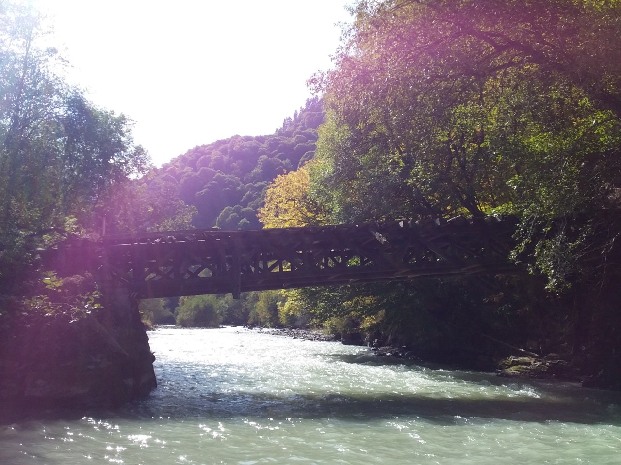 Километров тридцать порожистой Кубани до Каньона Аманхит, но мы его тоже на ходили. Пороги не выражены. Река сама сплошной порог. В русле много гигантских камней и скальных останцев. Реку сопровождает дорога Карачаевск-Хурзук, то по правому берегу, то по левому, перебегая по переброшенным через поток мостам.