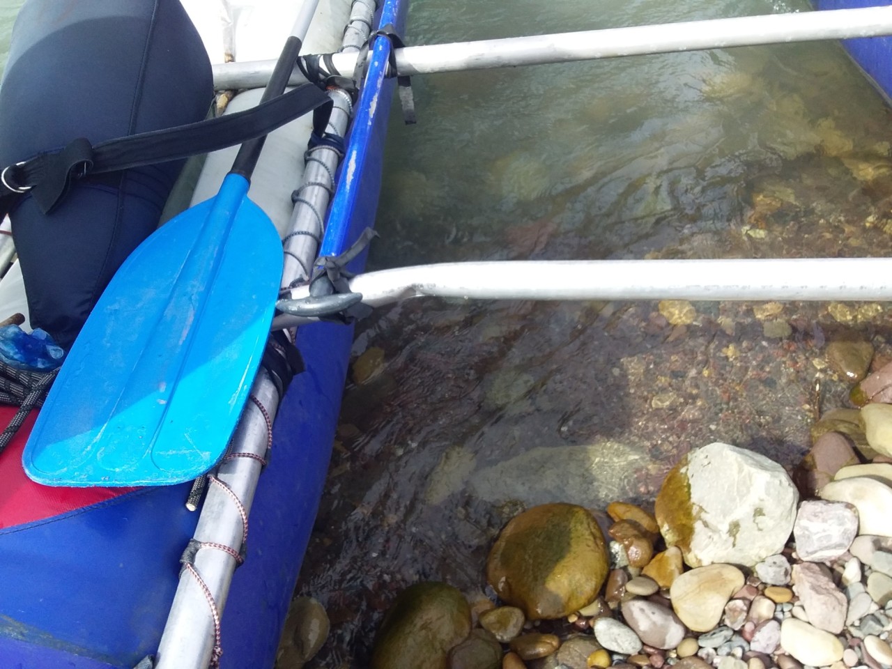 Это по малой воде Аксаут это нечто катамаранодробильное. Довольно тщедушный поток скатывается среди агромадных хаотично набросанных в русле валунов. Пока проехали этот непротяженный участок – много раз нас успело намыть на камни. На Рунте еще и смыло и размотало спасконец-морковку. Забитые от интенсивной гребли руки и одышка.