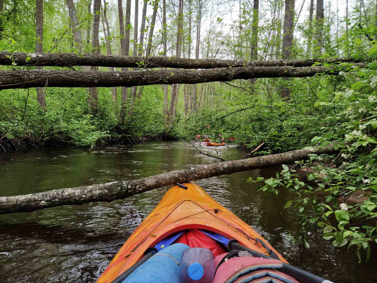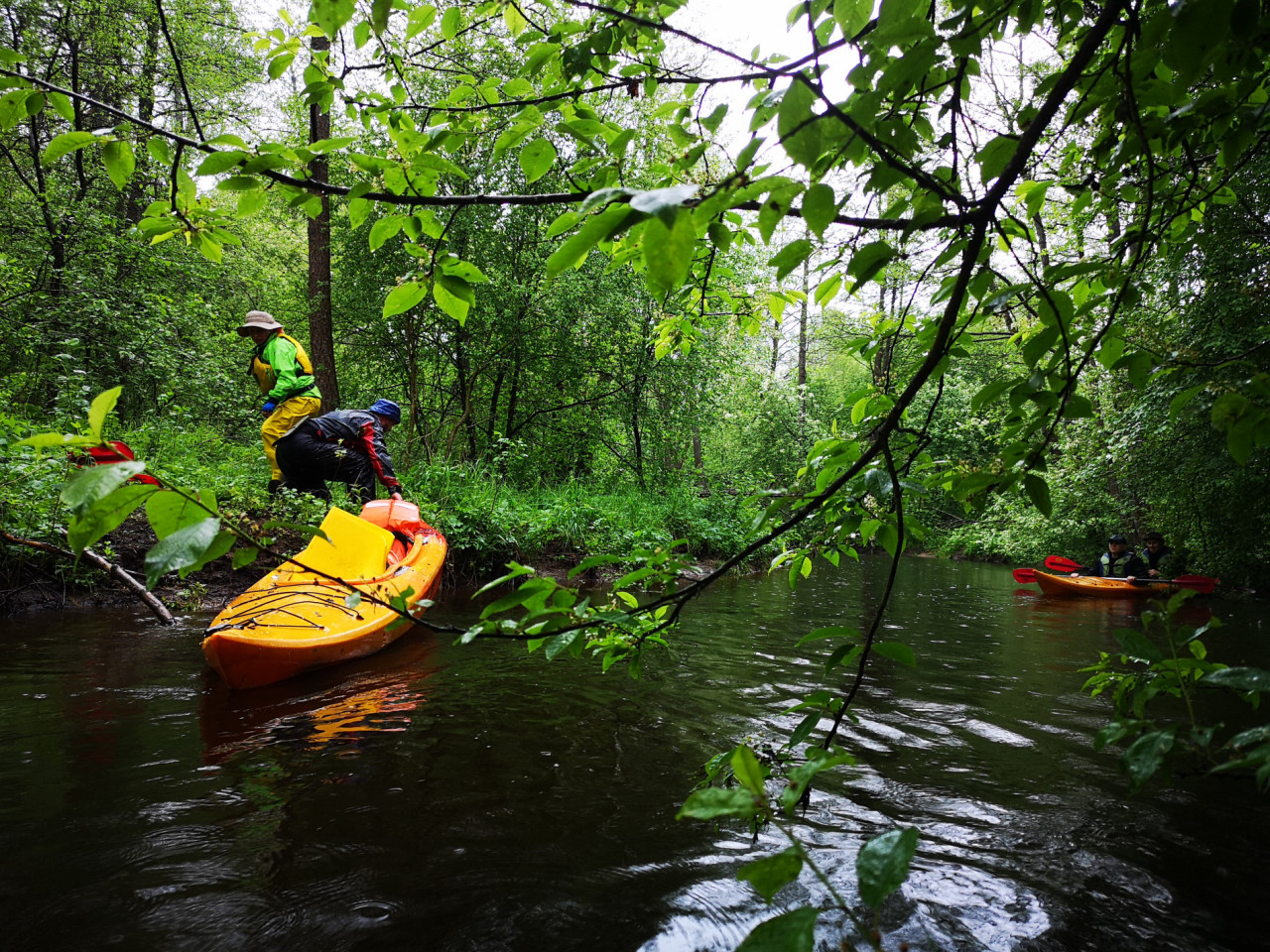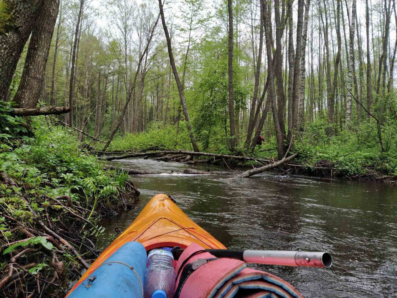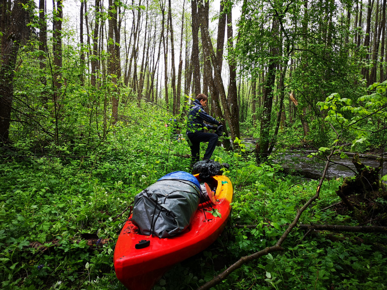 И завалы тоже встречались. Не расслабишься, все время нужно быть начеку. Из-за каждого поворота выбегает какая-нибудь очередная водная структура. И нужно успеть её прочесть. Часто экипажи причаливали, чтобы вылить из байдарок воду. Плотная и сочная травянистая растительность к концу мая поднялась на берегах. Низко над водой свисали ветки. Приходилось пригибаться или вовсе от них энергично отгребать.