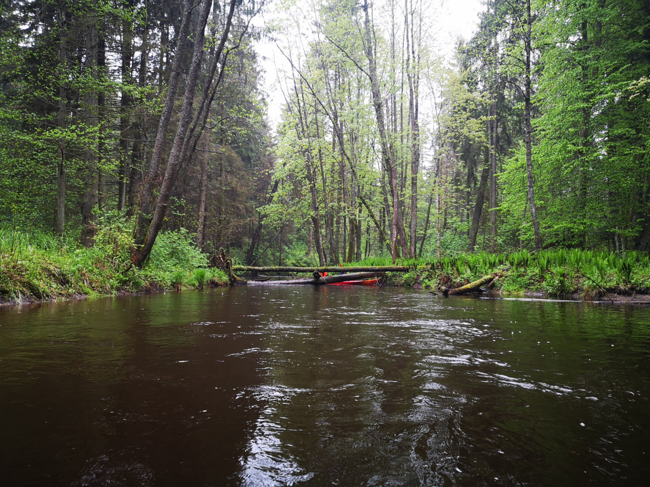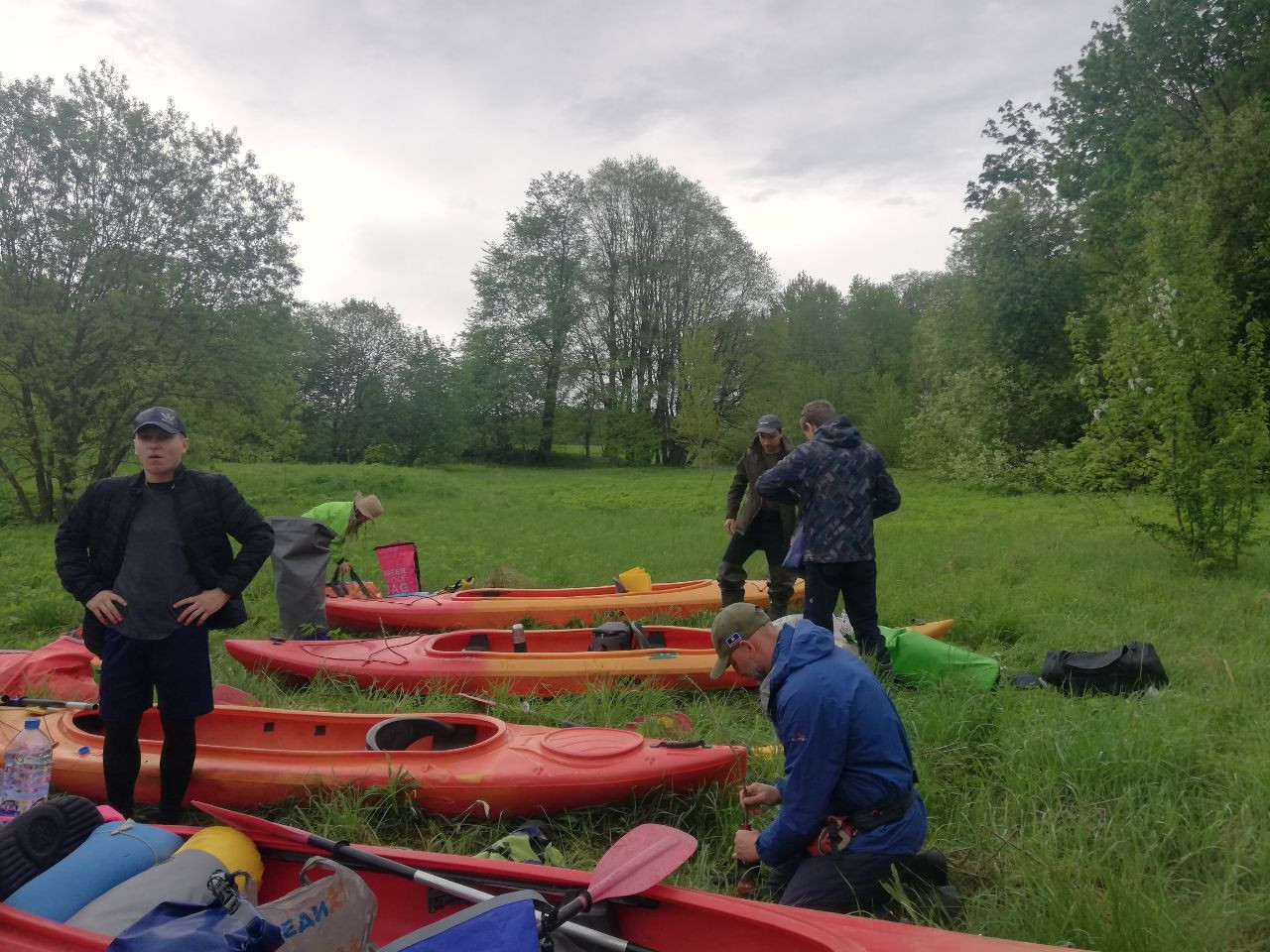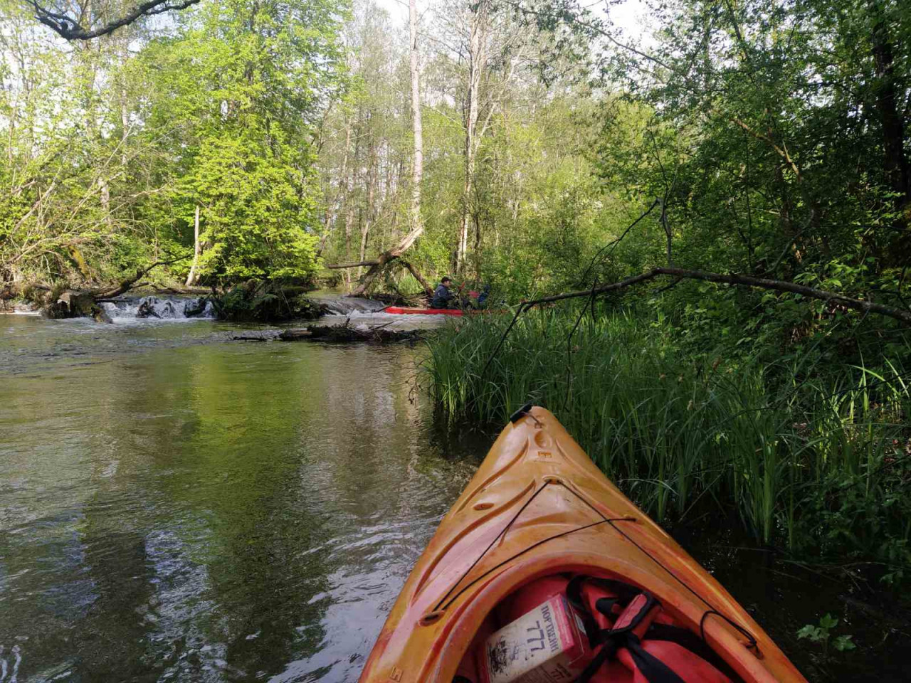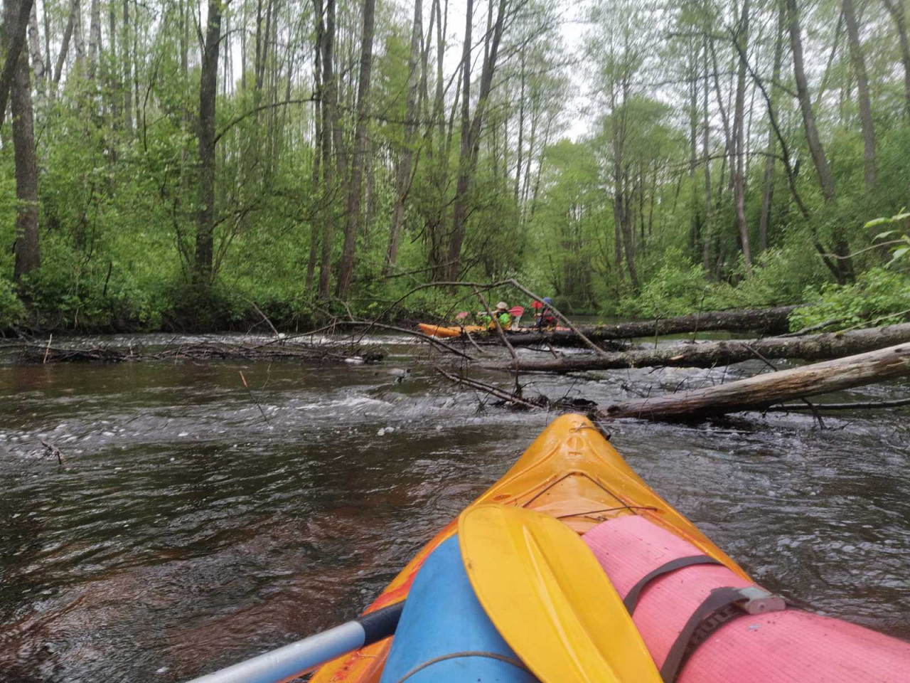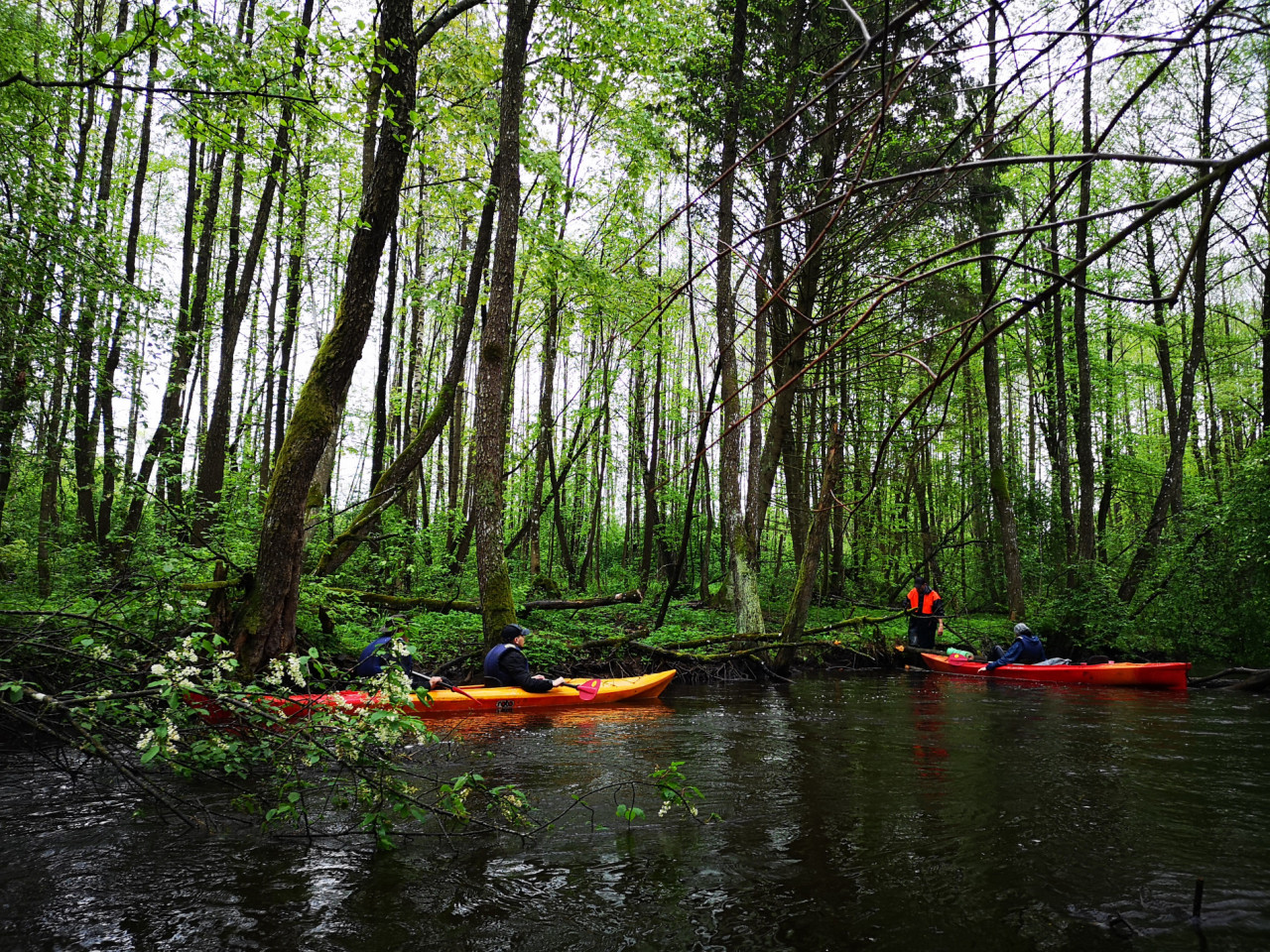 И завалы тоже встречались. Не расслабишься, все время нужно быть начеку. Из-за каждого поворота выбегает какая-нибудь очередная водная структура. И нужно успеть её прочесть. Часто экипажи причаливали, чтобы вылить из байдарок воду. Плотная и сочная травянистая растительность к концу мая поднялась на берегах. Низко над водой свисали ветки. Приходилось пригибаться или вовсе от них энергично отгребать.