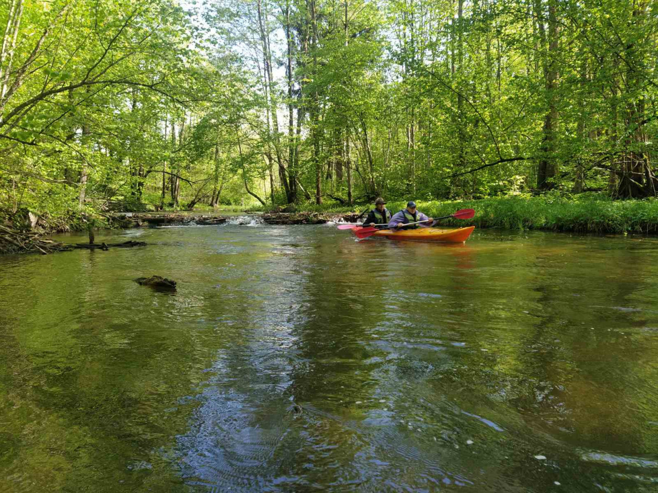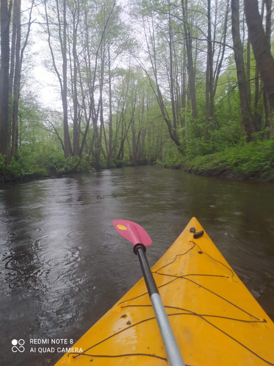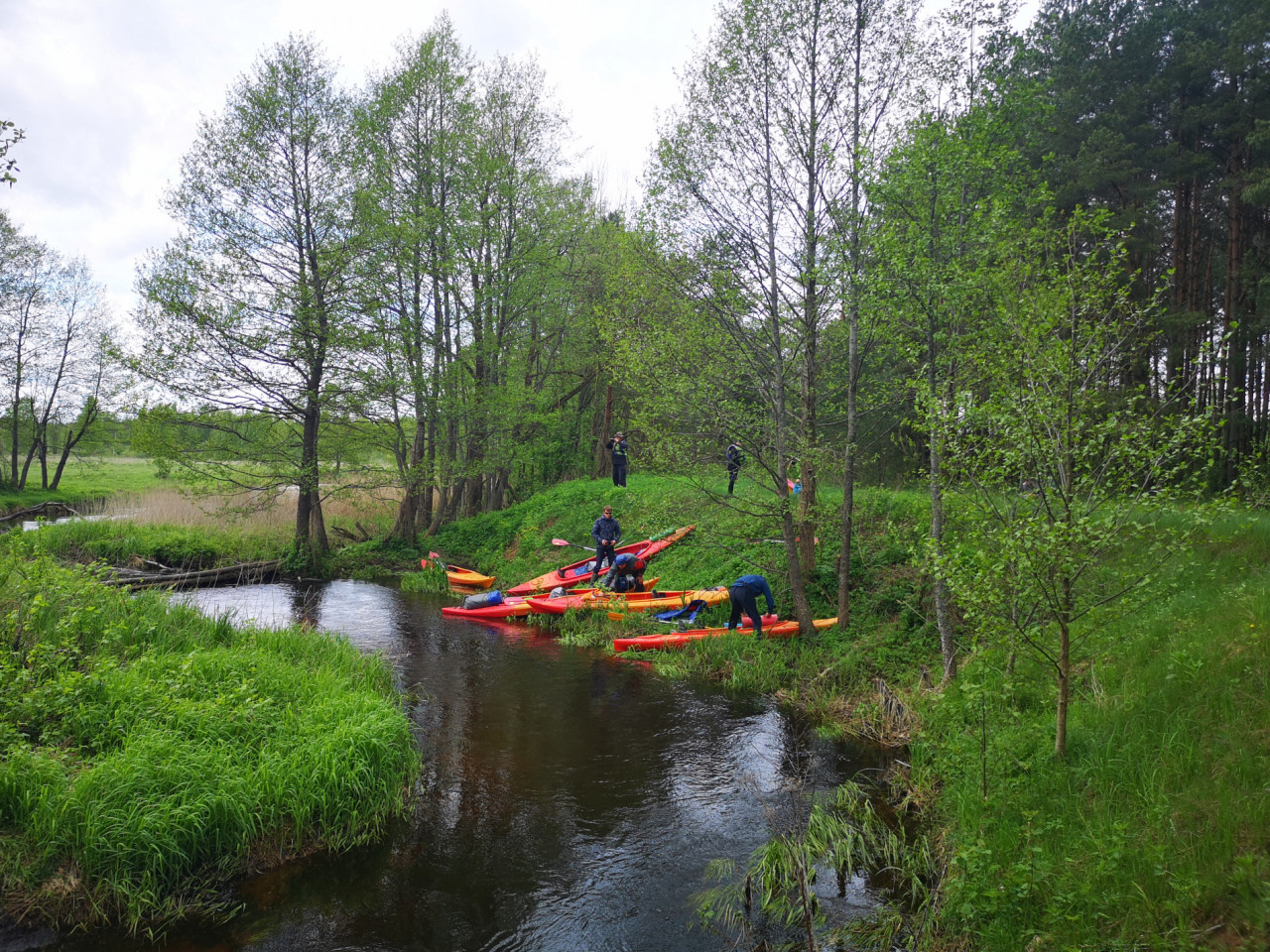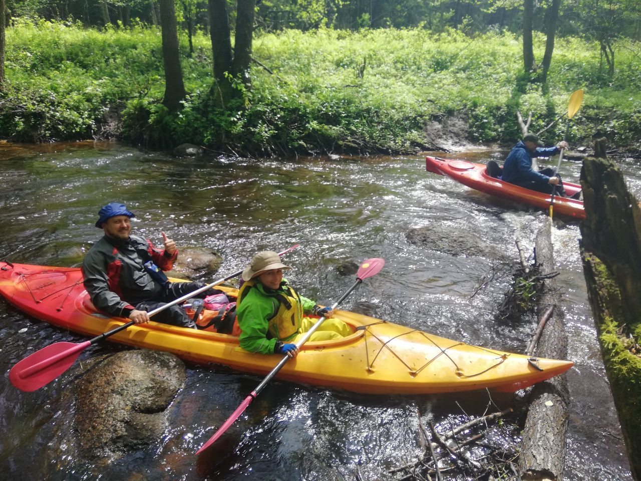 И завалы тоже встречались. Не расслабишься, все время нужно быть начеку. Из-за каждого поворота выбегает какая-нибудь очередная водная структура. И нужно успеть её прочесть. Часто экипажи причаливали, чтобы вылить из байдарок воду. Плотная и сочная травянистая растительность к концу мая поднялась на берегах. Низко над водой свисали ветки. Приходилось пригибаться или вовсе от них энергично отгребать.