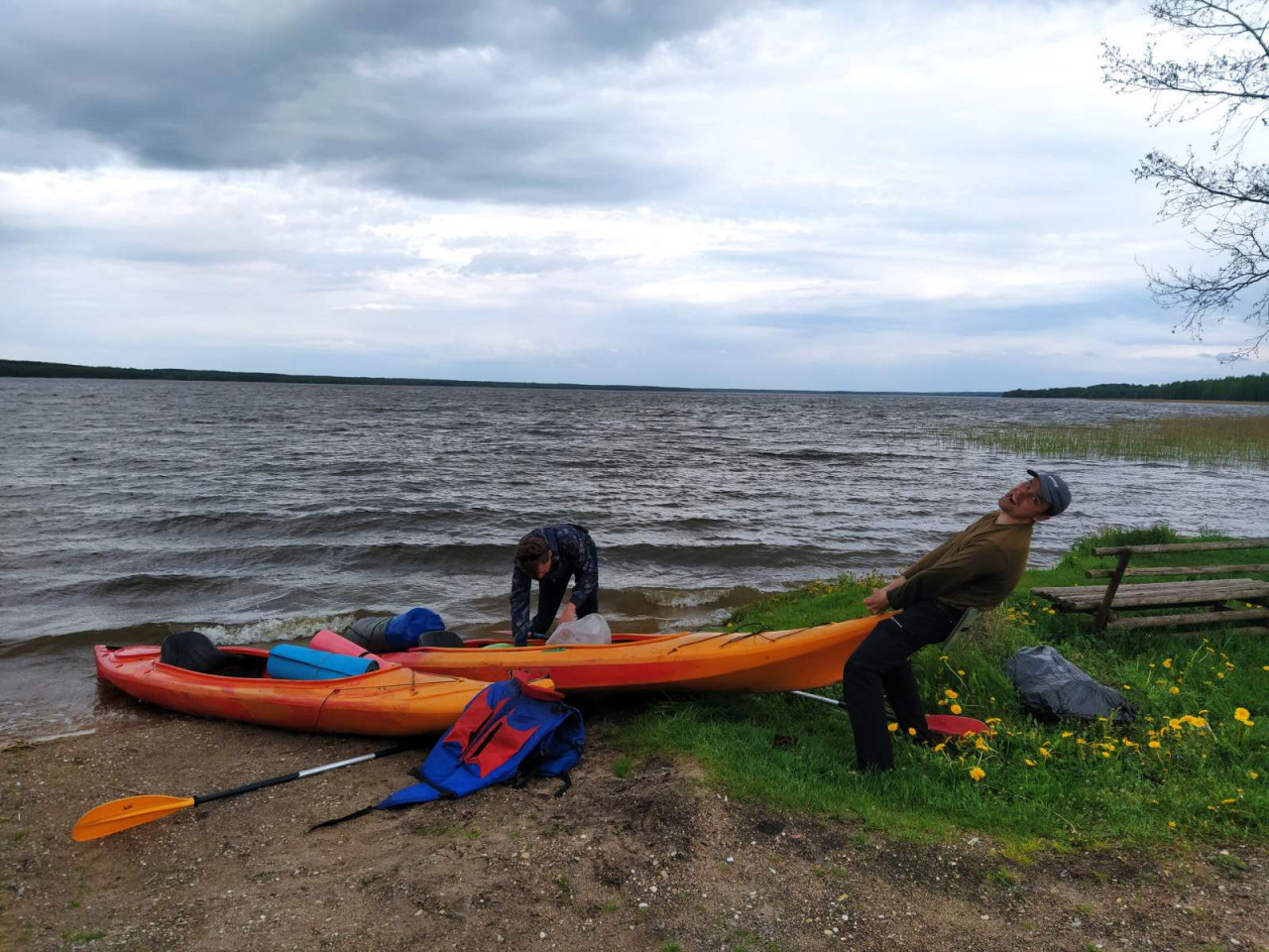 Место для лагеря - оборудованный беседками, мусорными контейнерами и даже деревянными туалетами твердый берег. Выдавался он характерным мысом. На западном берегу. Ориентир весьма удобный.