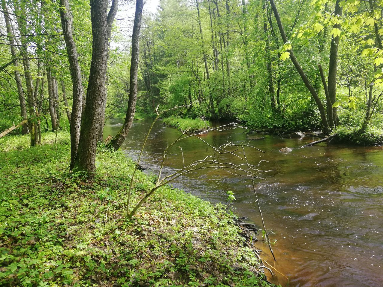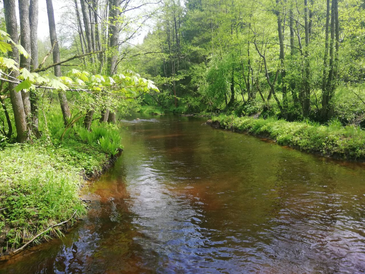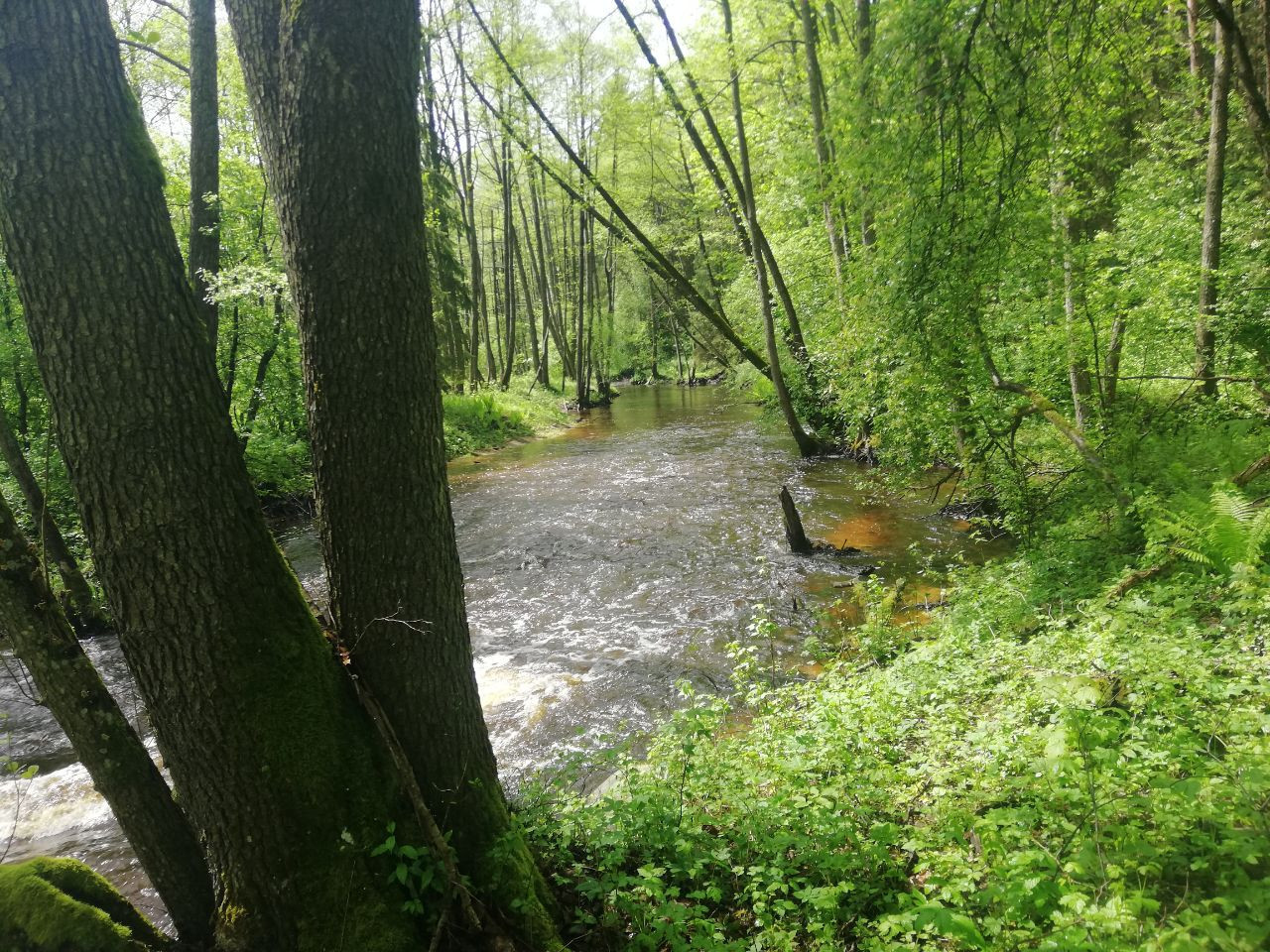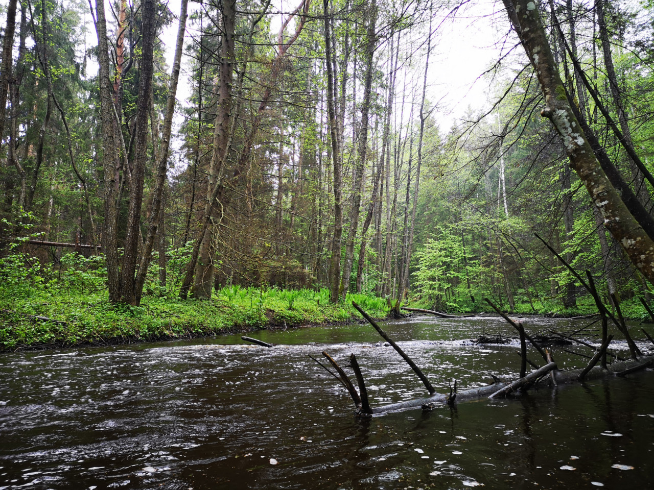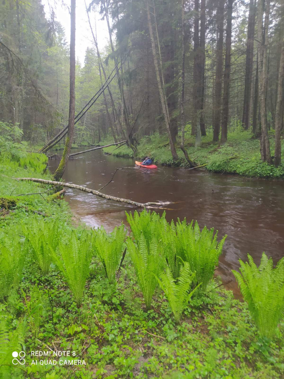 С обеих сторон реку плотно сопровождают в большинстве лиственные заросли. Береза, осина, ольха, лещина. На подмытых берегах конгломераты переплетающихся корней. Шел дождь. Временами усиливался. Капало с деревьев. От падающих капель дрожала листва, шелестела. Будто это были джунгли в сезон дождей. Молодые папоротники этот эффект усиливали.