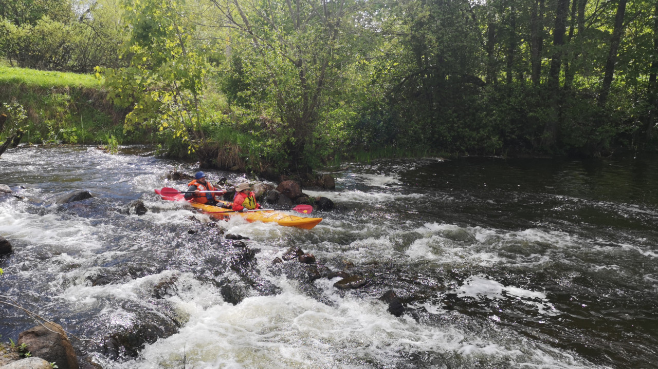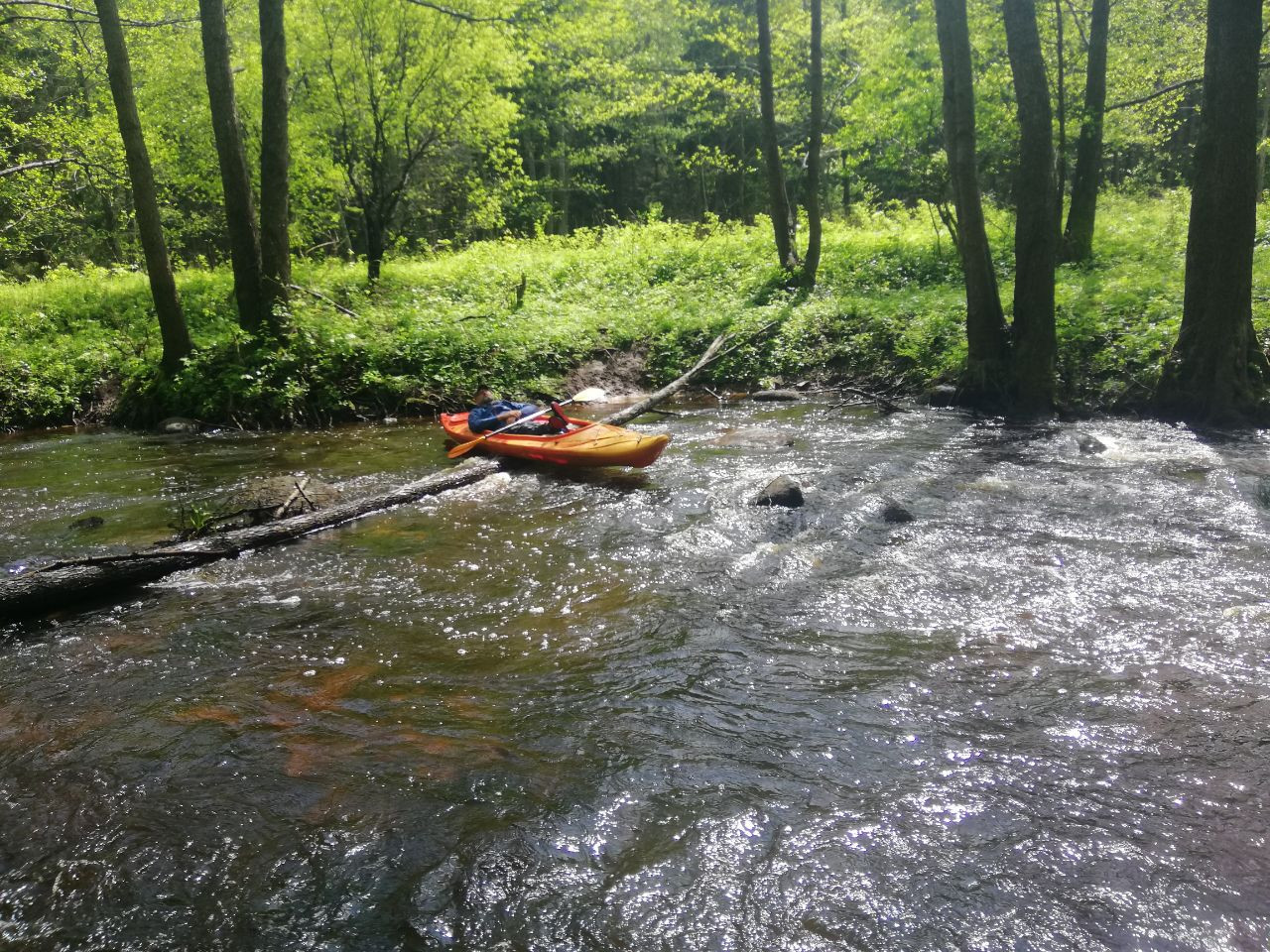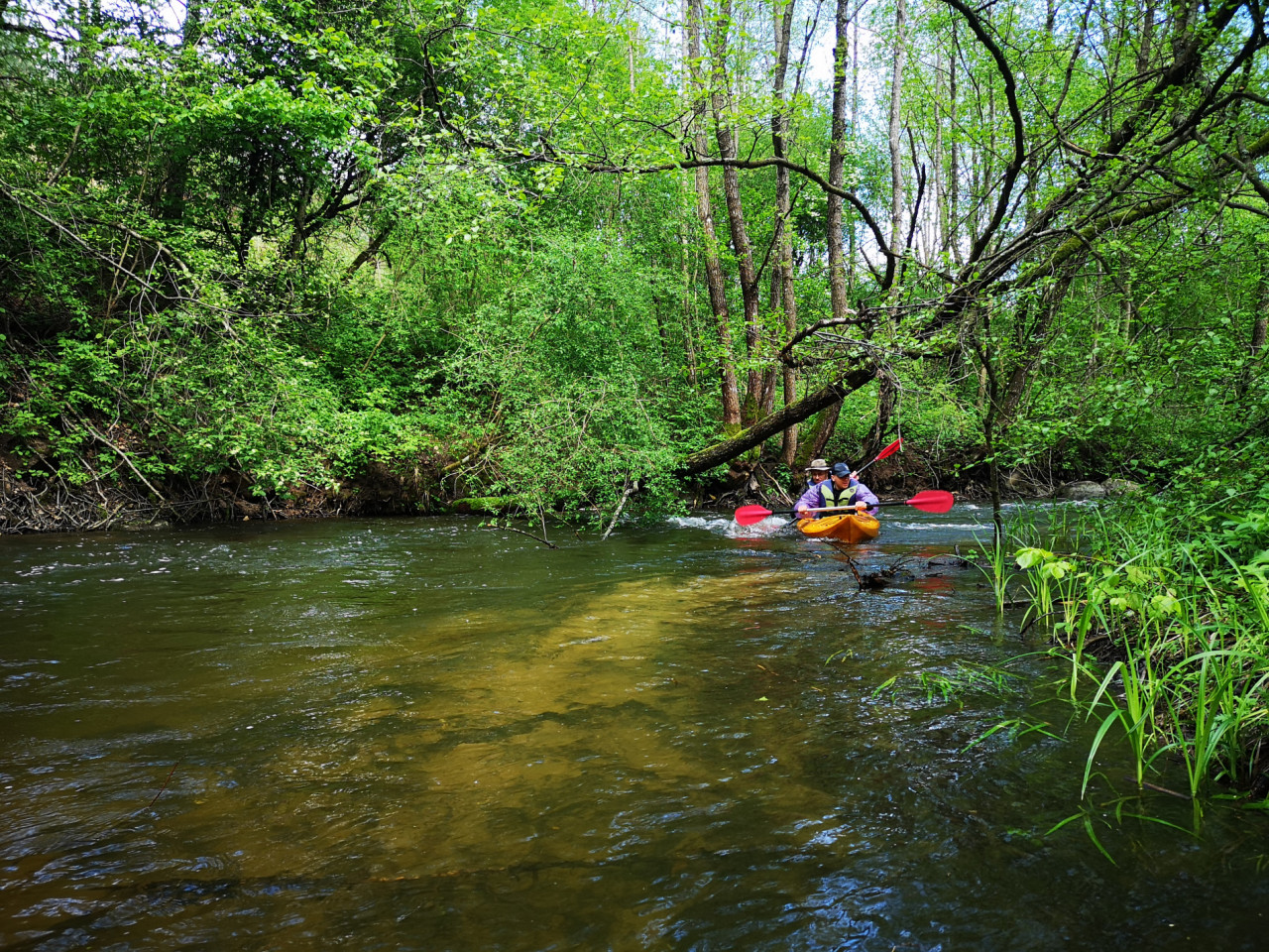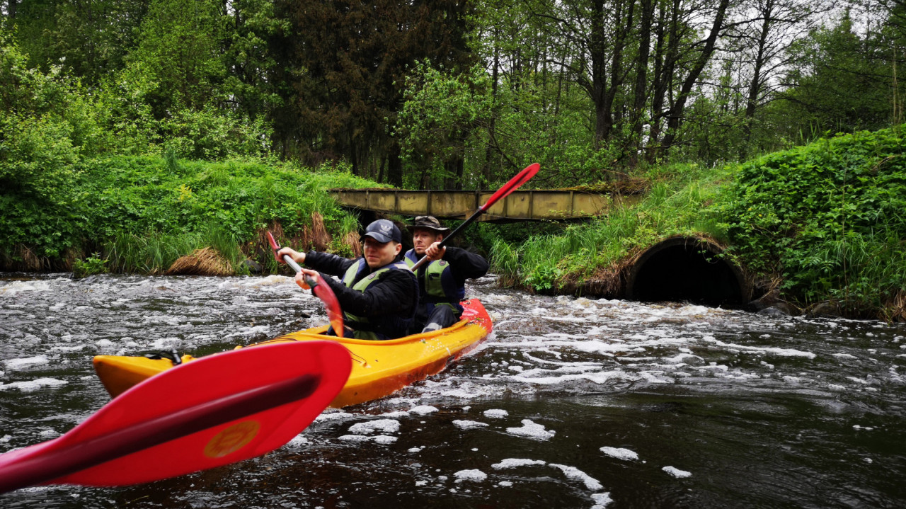 Много перекатов, залежей камней встретилось на пути. Отдельные валуны попадались в русле не характерных для Беларуси размеров. Нередко преграждали путь переброшенные через русло мостики. Одно из препятствий было особенно оригинального свойства. Точно почти, как в декабре на реке Сула. Это прохождение через трубу. Только воды в трубе больше. Ощущение при сливе в трубу, словно ты в аквапарке на аттракционе свет в конце тоннеля. Требуется пригнуться, сгруппироваться, нахуй-блядь. Когда смотришь на нижнюю апертуру трубы, байдарки оттуда выстреливает, будто под давлением.