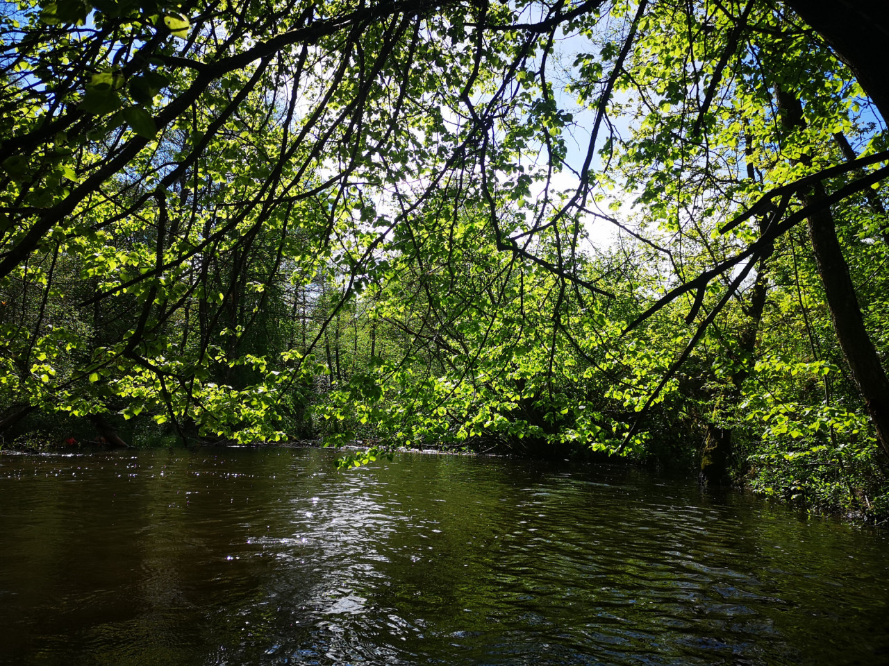 Как здесь весной красиво и уютно! Не жарко. Это прям температура комфорта. Солнце почти не пробивает перекрывающиеся над рекой кроны деревьев. Повороты на реке Перекоп плавные. Нельзя назвать её извилистой. Да и на карте она почти выглядит канализовано.