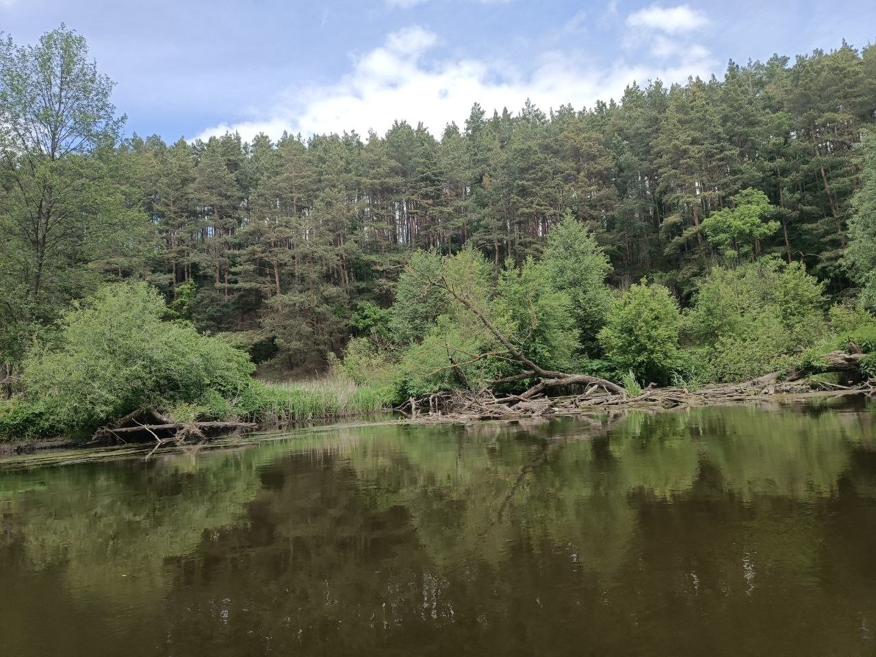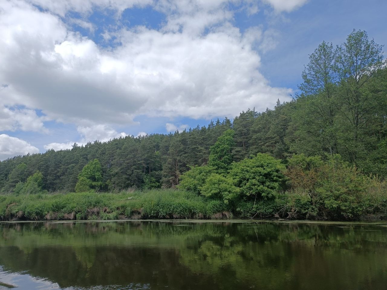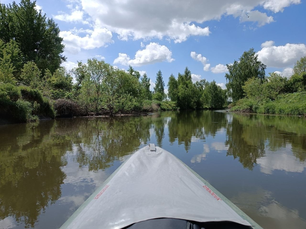 Хватает техногенки и населенки. Но это не мешает обитать здесь огромным белым лебедям-шипунам. Лес отдельными клиньями подходит непосредственно к воде лишь в нескольких местах. К середине пути появляется верный ориентир. Ветер доносит ароматы от ассенизационных сооружений доверху забитых говном в районе деревни Лысовщина. Скорость течения существенная. Идти поэтому получается быстро.