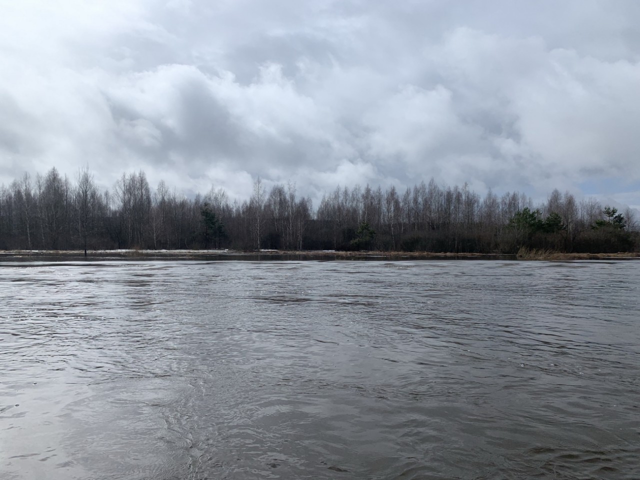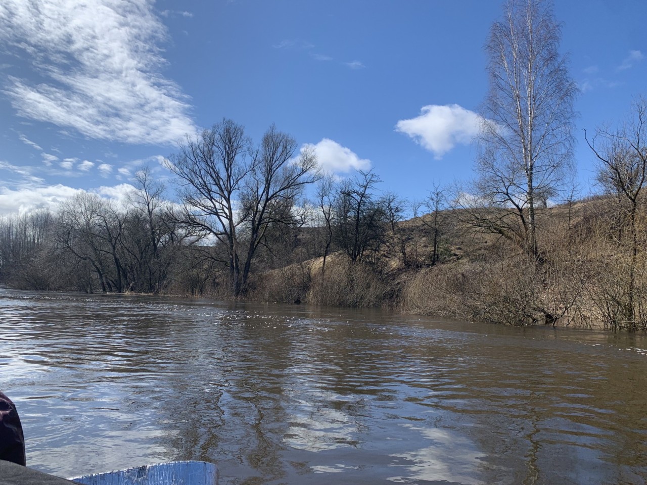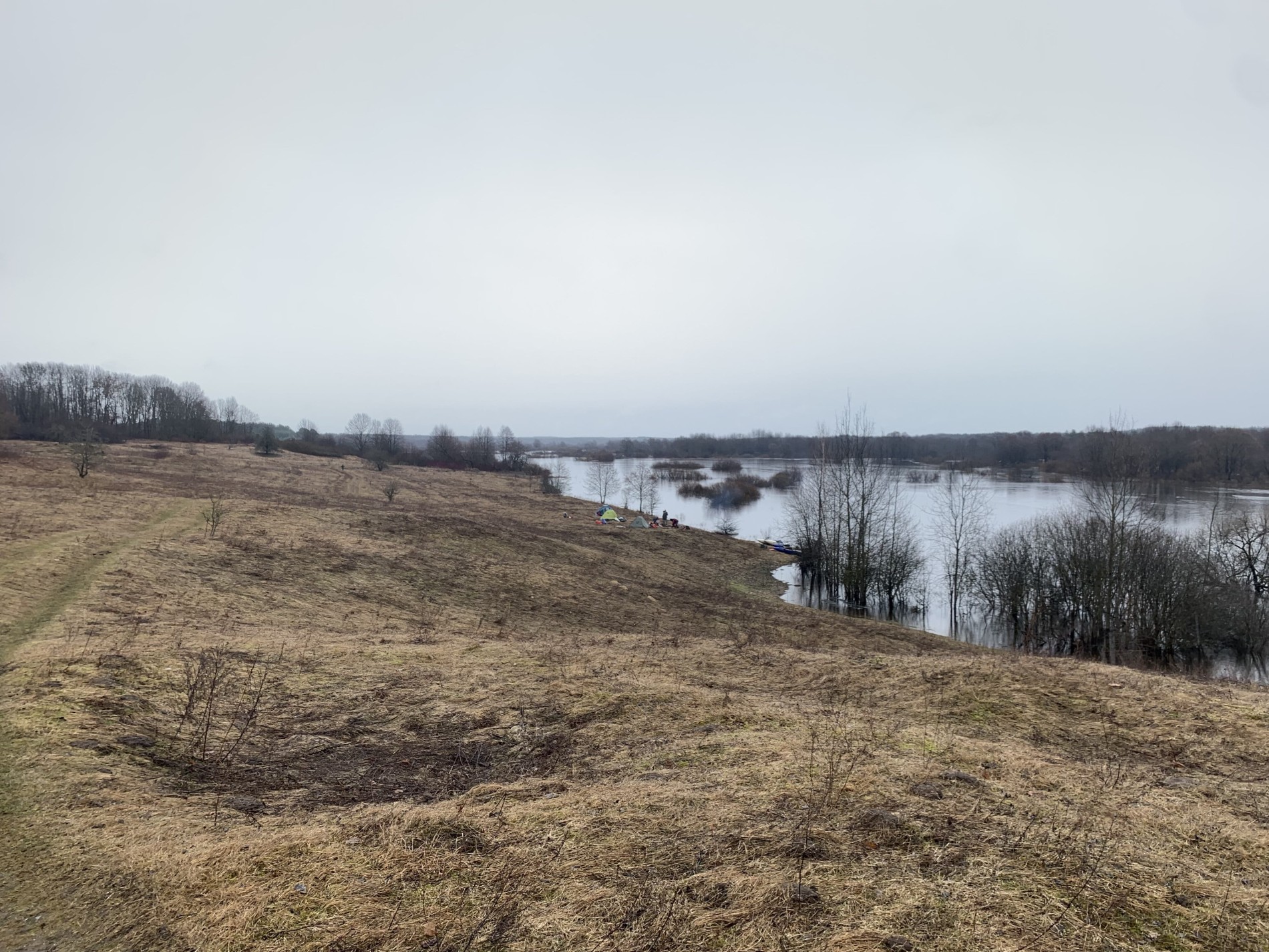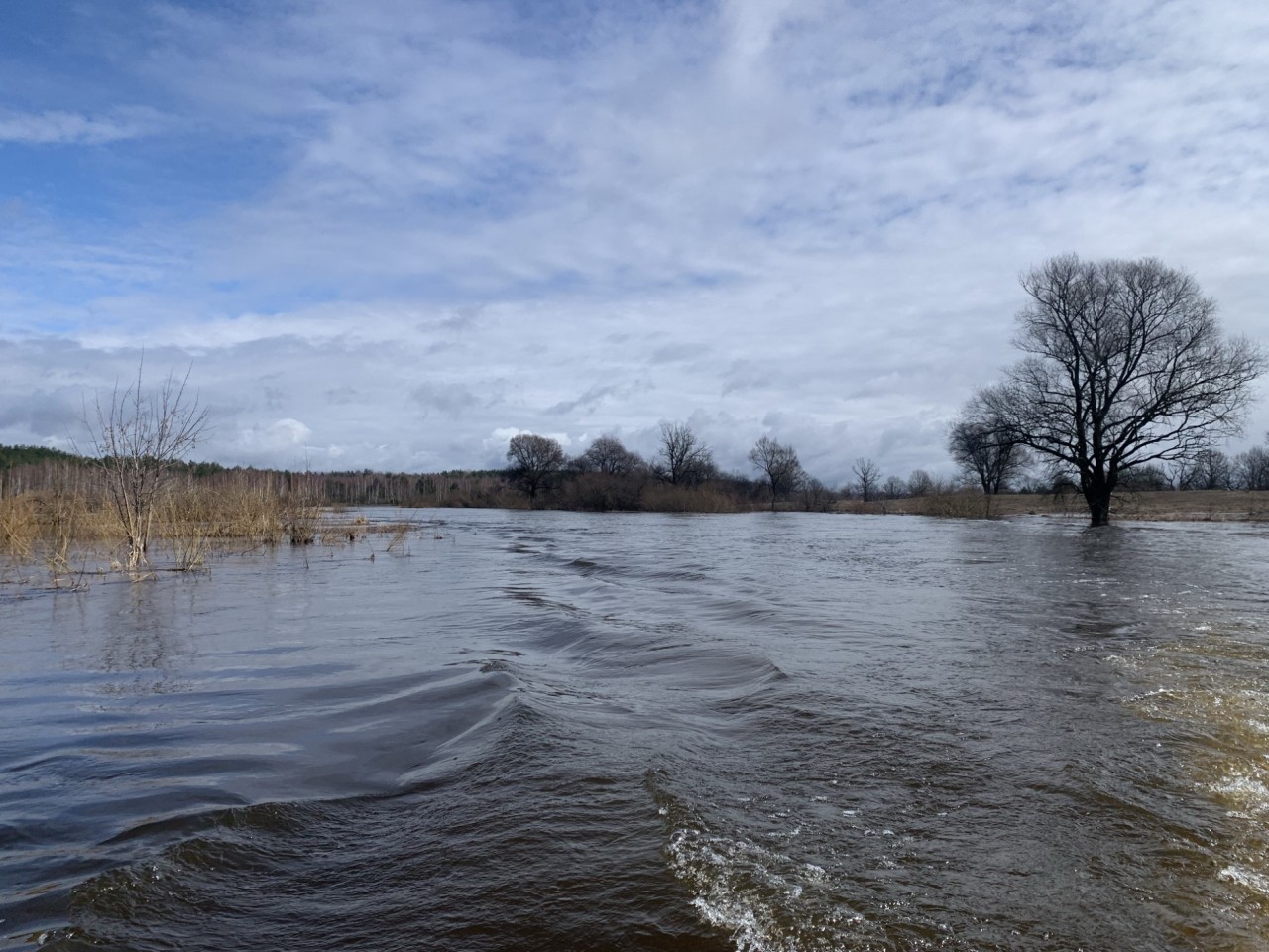 К вечеру, когда рассеялся туман, над нами, ребятами, высоко нависло довлеющее свинцовое небо. Было все так же безветренно. Находились мы, как и предполагали, на левом коренном берегу. Полого, но верно поднимался тут же унылый травянистый склон. Остер разбух до невероятных размеров. Правый противоположный берег здесь тоже сравнительно высокий, поросший густым лиственным лесом. Так что именно в этом месте не разливалась река в «море», как это было выше. Однако, трафик проходящей воды был выше всякого воображения. Среди неё, вышедшей и затопившей коренные берега воды, лохмами торчали затопленные скопления кустов. Как и осенью, по берегам мы не видели ни одного человека. Вокруг было всё так же пустынно. Будучи в Беларуси, казалось, что мы в затерянном мире.