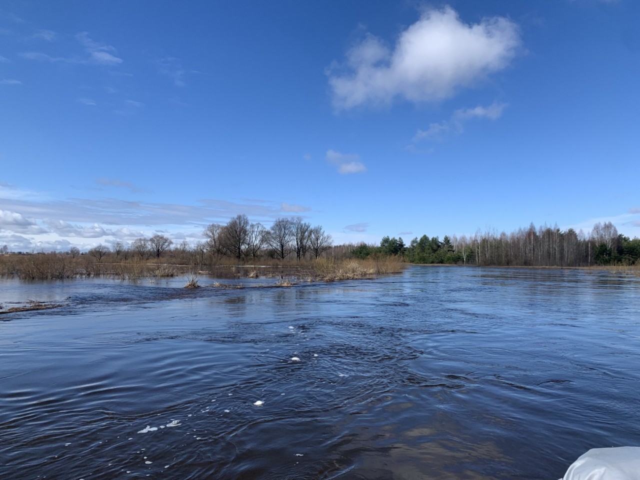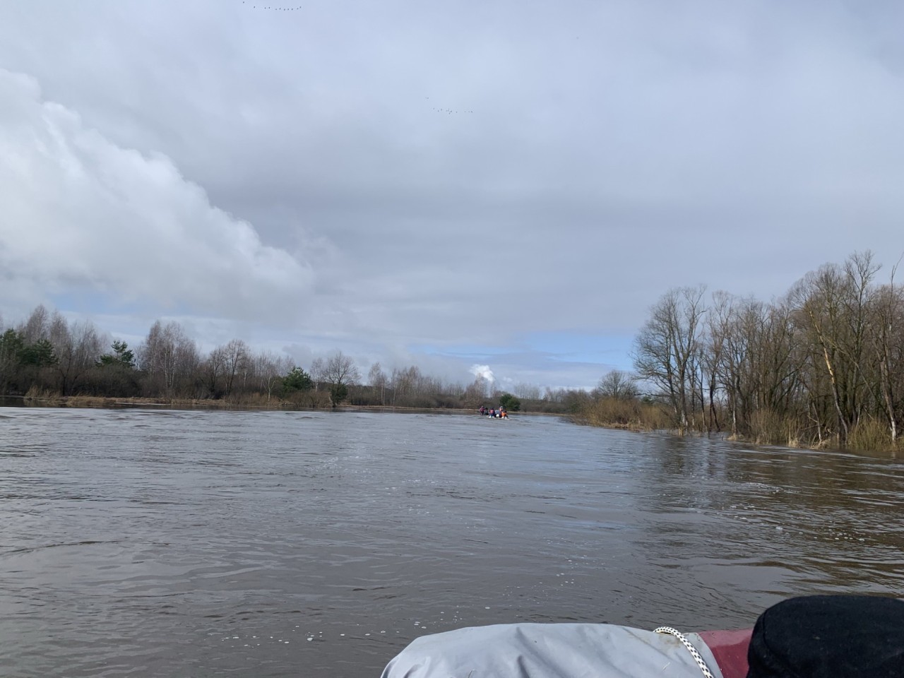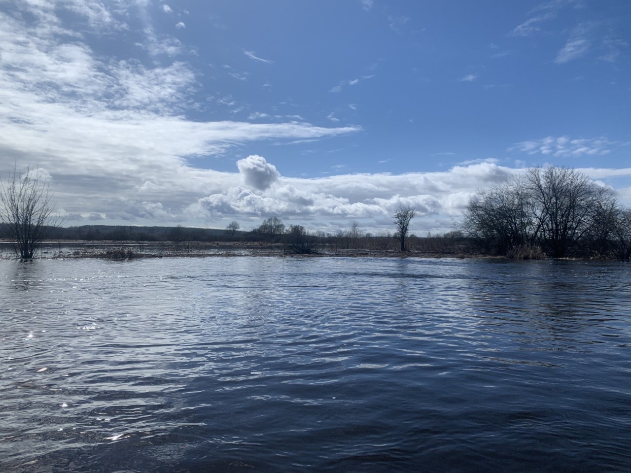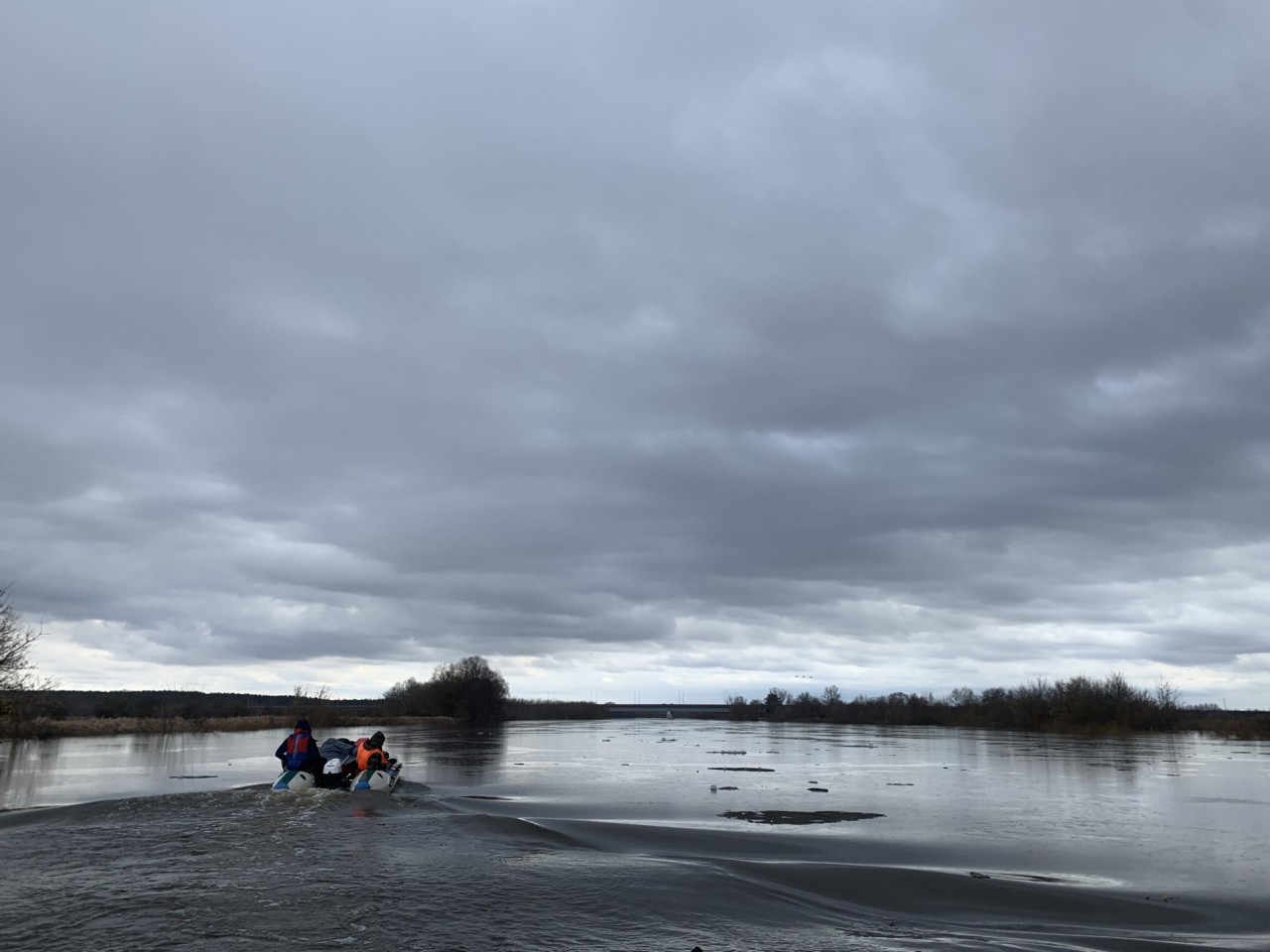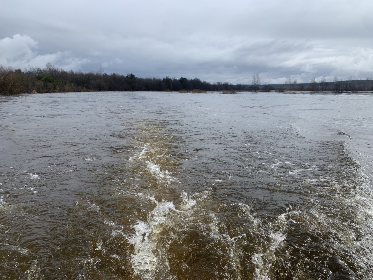 К вечеру, когда рассеялся туман, над нами, ребятами, высоко нависло довлеющее свинцовое небо. Было все так же безветренно. Находились мы, как и предполагали, на левом коренном берегу. Полого, но верно поднимался тут же унылый травянистый склон. Остер разбух до невероятных размеров. Правый противоположный берег здесь тоже сравнительно высокий, поросший густым лиственным лесом. Так что именно в этом месте не разливалась река в «море», как это было выше. Однако, трафик проходящей воды был выше всякого воображения. Среди неё, вышедшей и затопившей коренные берега воды, лохмами торчали затопленные скопления кустов. Как и осенью, по берегам мы не видели ни одного человека. Вокруг было всё так же пустынно. Будучи в Беларуси, казалось, что мы в затерянном мире.
