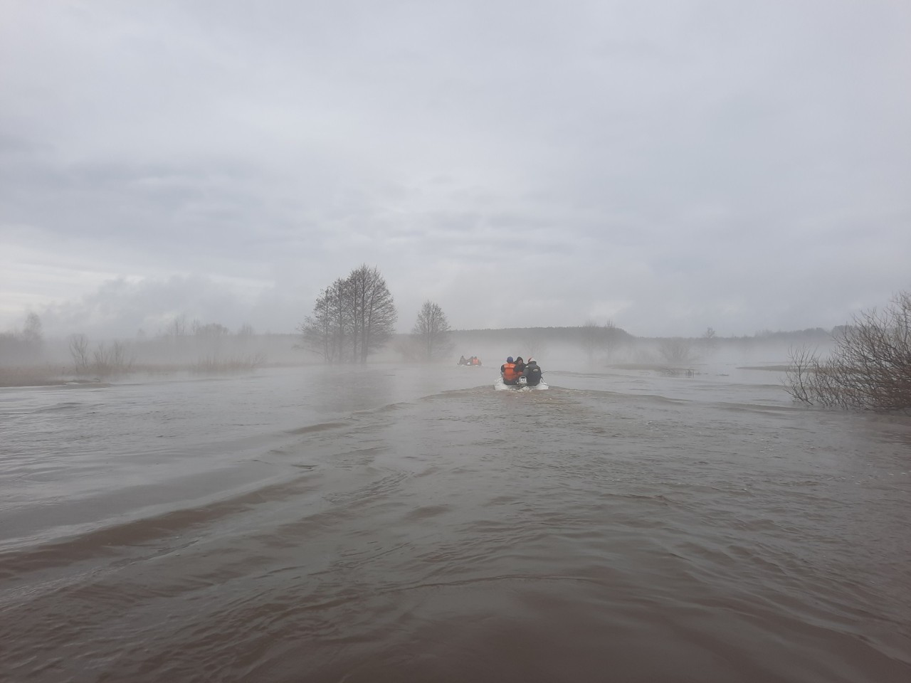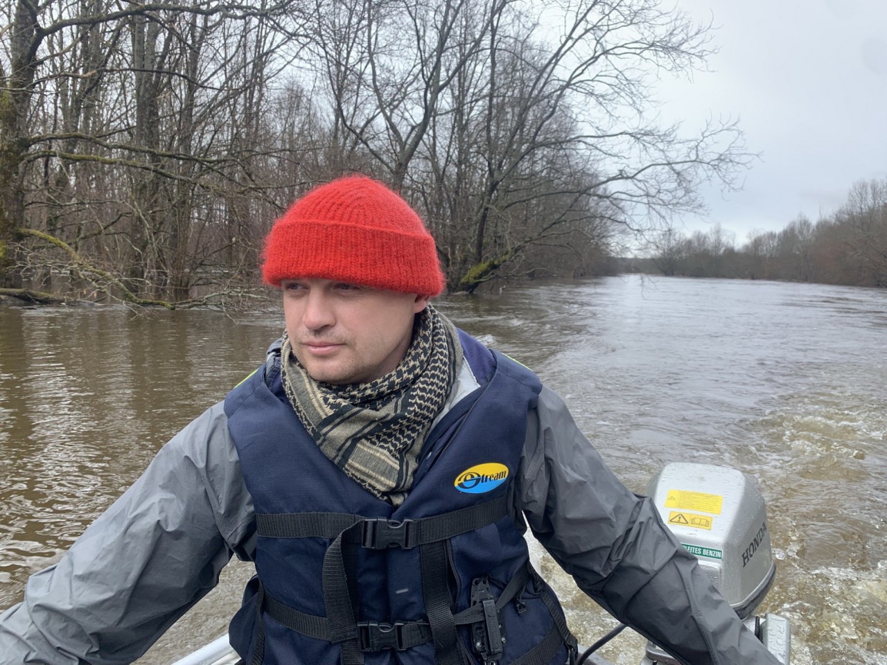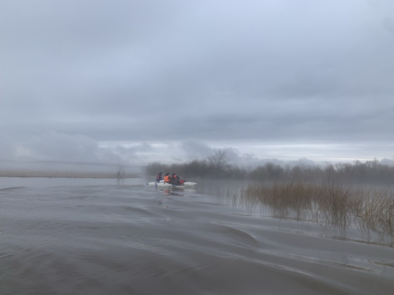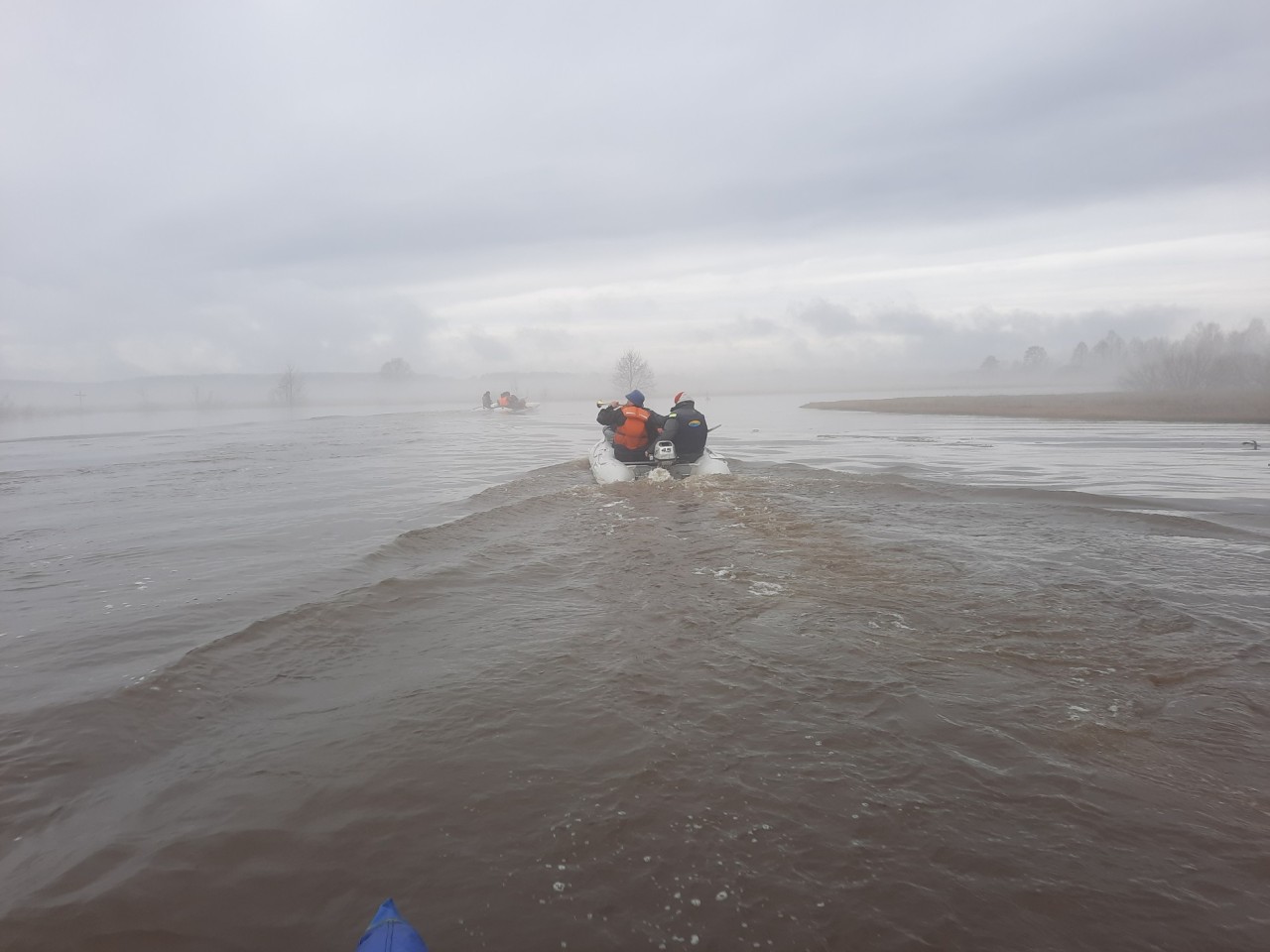 К вечеру, когда рассеялся туман, над нами, ребятами, высоко нависло довлеющее свинцовое небо. Было все так же безветренно. Находились мы, как и предполагали, на левом коренном берегу. Полого, но верно поднимался тут же унылый травянистый склон. Остер разбух до невероятных размеров. Правый противоположный берег здесь тоже сравнительно высокий, поросший густым лиственным лесом. Так что именно в этом месте не разливалась река в «море», как это было выше. Однако, трафик проходящей воды был выше всякого воображения. Среди неё, вышедшей и затопившей коренные берега воды, лохмами торчали затопленные скопления кустов. Как и осенью, по берегам мы не видели ни одного человека. Вокруг было всё так же пустынно. Будучи в Беларуси, казалось, что мы в затерянном мире.