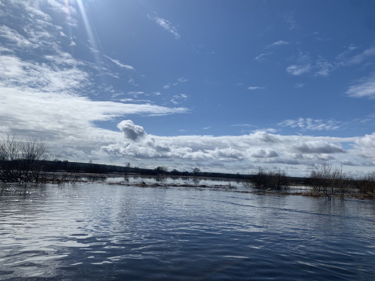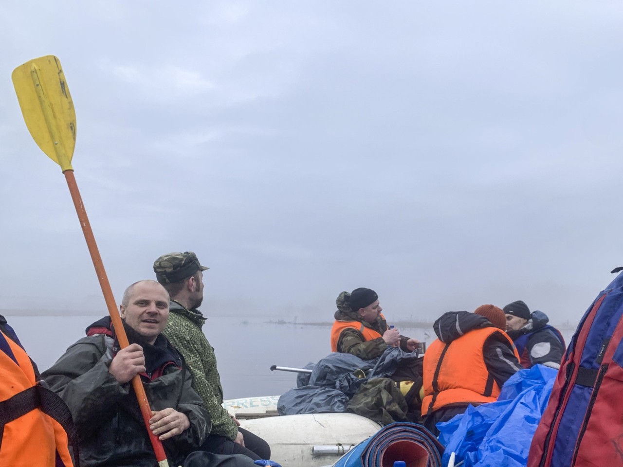 В сентябре на 9 человек был один мотор в 5 л.с. Лодкой с оным приходилось тянуть огромный пузатый рафт. Воды тогда катастрофически не хватало. Досаждали постоянные мели и преграждающие путь коряги. Теперь (как свойственно Глазу) крайность была уже другого свойства. Воды было столько, что ПВД и поставленная задача превратились в перфоманс по «морю», мой генерал.