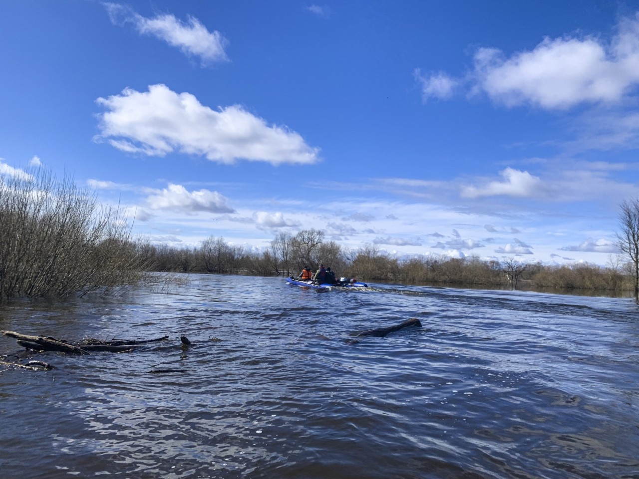 Мы заблудились опять. Сбиться было не мудрено. Кроме потока по фарватеру было и течение другое – из переполненной реки вода стекала на пойму. Так бывает. Я многократно уже подобное видел. С таким потоком вынесло в ебеня и нас. Искали потом, рыскали, садились на кочки, матерились и даже шли на веслах (моторам не хватало глубины). Найти фарватер не представлялось возможным кроме как по навигатору. Направление движения и куда мы сместились, то было известно. А вот как куда и как пробиться, это вопрос. Не везде хватает должной глубины. Да и кусты. Куда ни кинь. Ехали, проталкивали, пробирались, продирались.