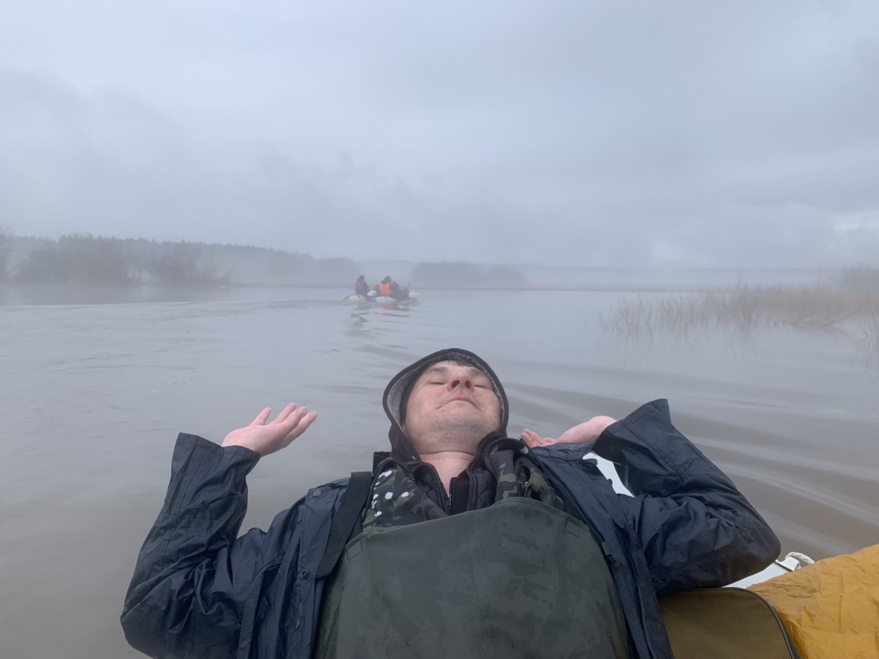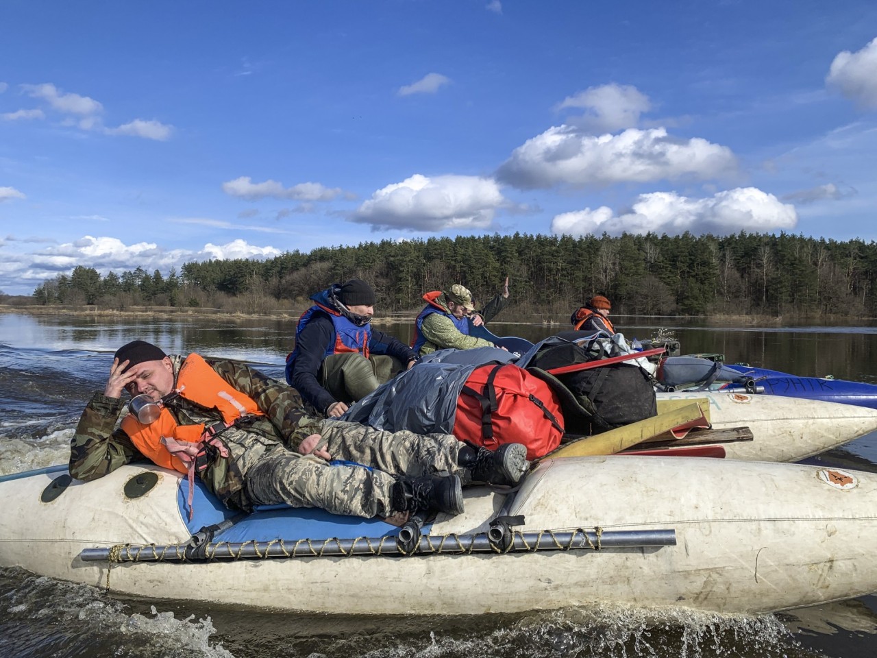 В таком формате похода, да еще и среди моря воды, не доводилось мне быть со времен студенчества, когда мы сплавлялись на плотах. Но там было хотя бы течение. А оно уж тяжелый плот вытащит. Я тогда, вот на реке Остер, вдруг вспомнил в том числе, как смотрел какой-то голимый российский фильм (не голимые российские фильмы большая редкость). Там сюжет таков, что солдат наказали и отправили со взводным на марш бросок. Так они вошли в туман, а, когда из него вышли, переместились во времени в Великую Отечественную Войну (дальше чернуха).