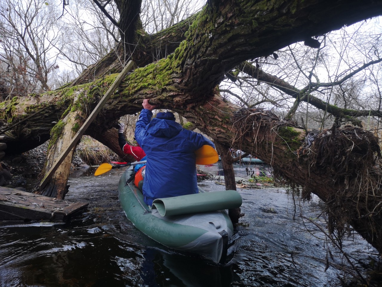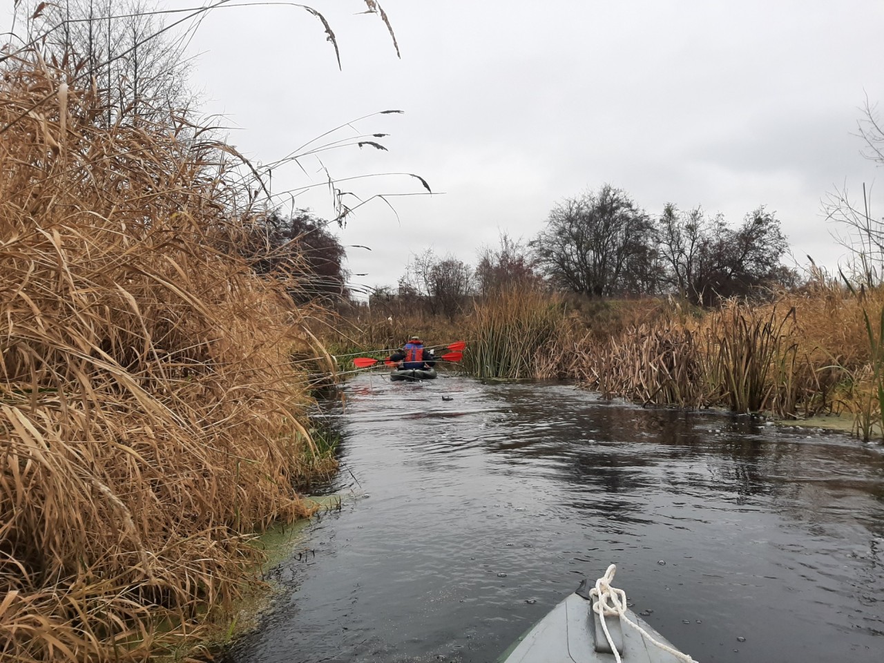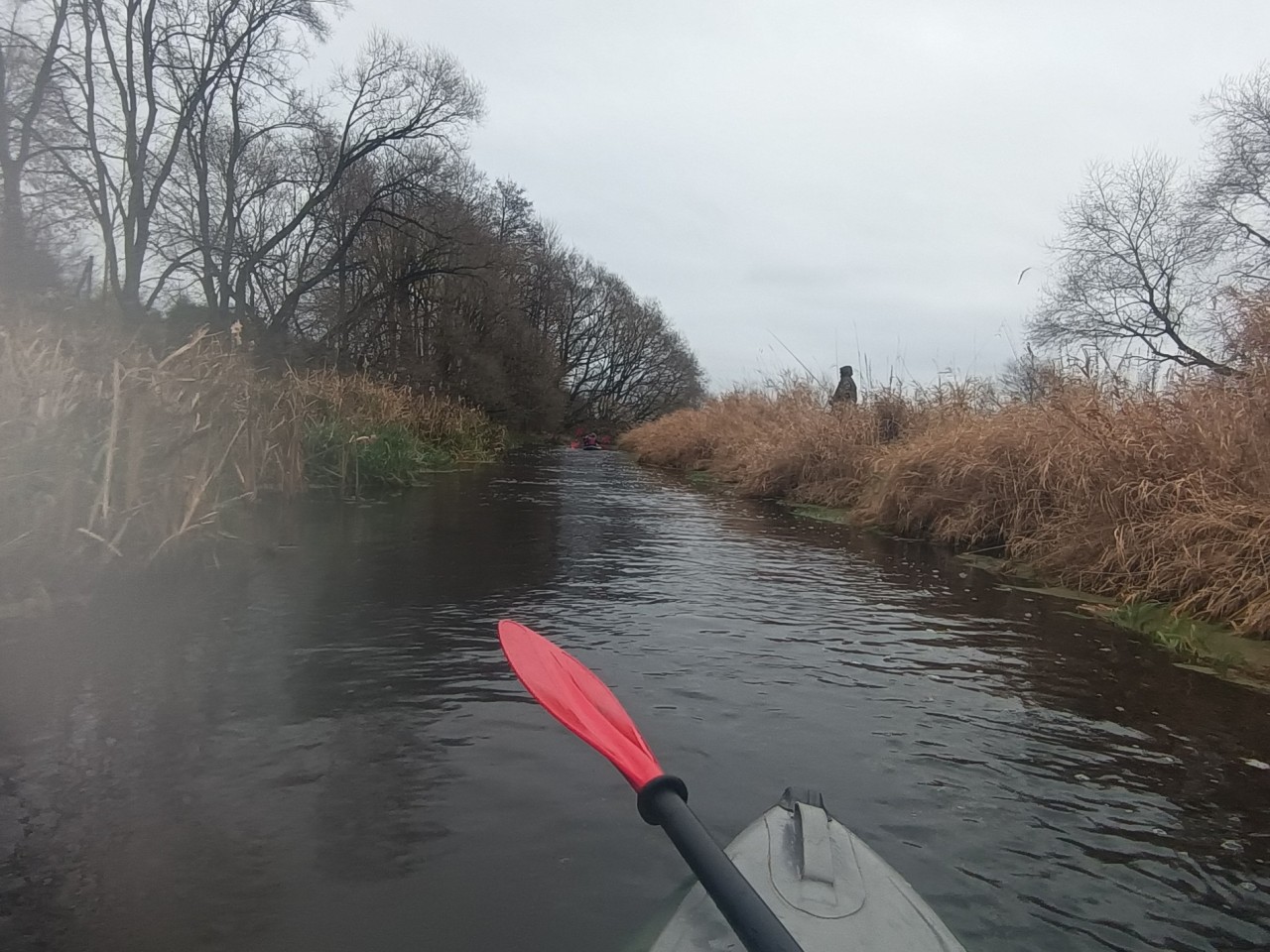 Она (Шацк) вскоре и началась. Появилось течение. Русло именно такое, когда весьма комфортно идти на байдарке. Берег в осоке, тростниках. Подходит то ближе, то отстоит дальше от воды вербьё. Закоряженность реки не сильная. Но периодически приходится пригибаться, маневрировать под и между корягами, покрытыми аксамитными мхами.