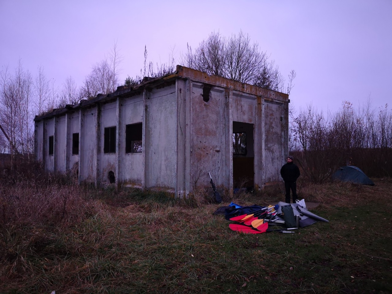 Водохранилище находится в неглубокой котловине меж высоток в виде полей. Скудное наименование деревьев имеется только лишь вдоль линии уреза воды. Стать решили возле бетонной коробки на берегу. Бетонная коробка раньше имела какое-то техническое значение. Скорее всего была это трансформаторная подстанция. Окон здесь не было, дверей тоже. В потолке и стенах дополнительные проломы. Через них должно быть демонтировалось оборудование. Кто-то решил заночевать на ковриках прямо здесь.