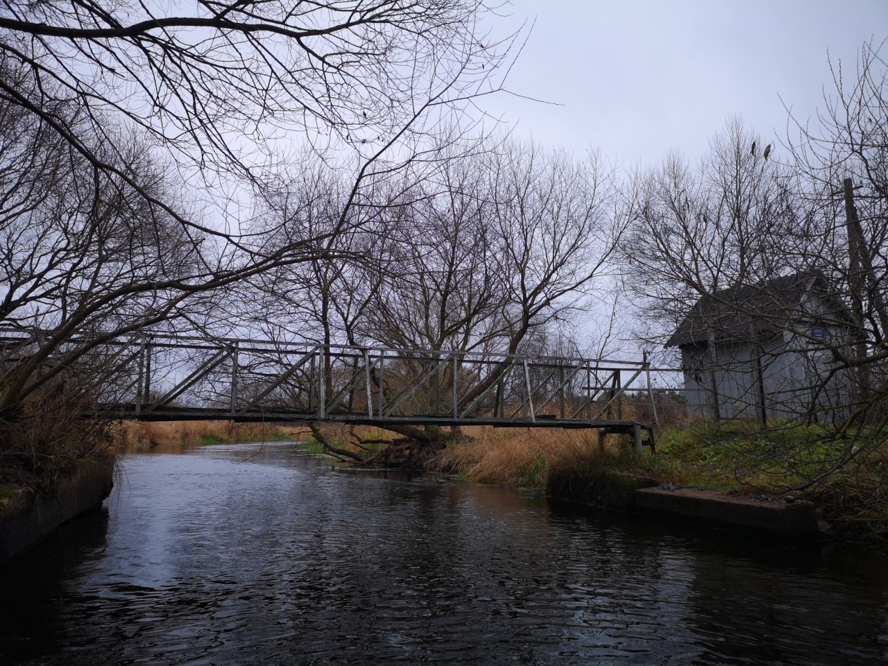Сразу после дамбы река представляет собой сравнительно широкий канал. Небо серое, сталистое. Погода по типу скорлупа. Вода почти стоячая. Ветер сегодня был редкого восточного направления – встречный. Он морщил воду. Вода сталистого оттенка. Канал лениво и плавно повернул к деревне.