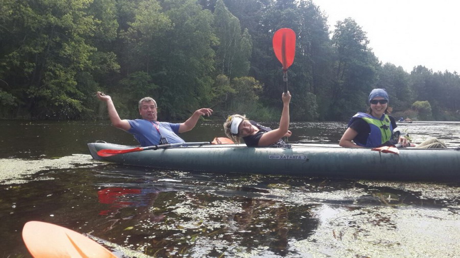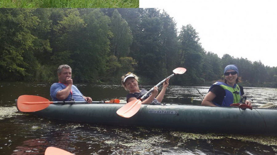 На воду спустились 5 байдарок, три тройки и две двойки. Стартанули уверенно, быстро, с настроением. Держаться решили вместе, без отрывов. Грести оказалось неожиданно легко, приятно и интересно. Мы с Олей быстро приспособились друг к другу, веслами махали в такт и научились направлять байдарку в нужную сторону. Саша, сидящий за капитана на корме, быстро это просек и особо не напрягался. В одной его руке поселилась дымящаяся сигарета, во второй- двушка пива. Не переставая нас нахваливать, Саша периодически напевал: