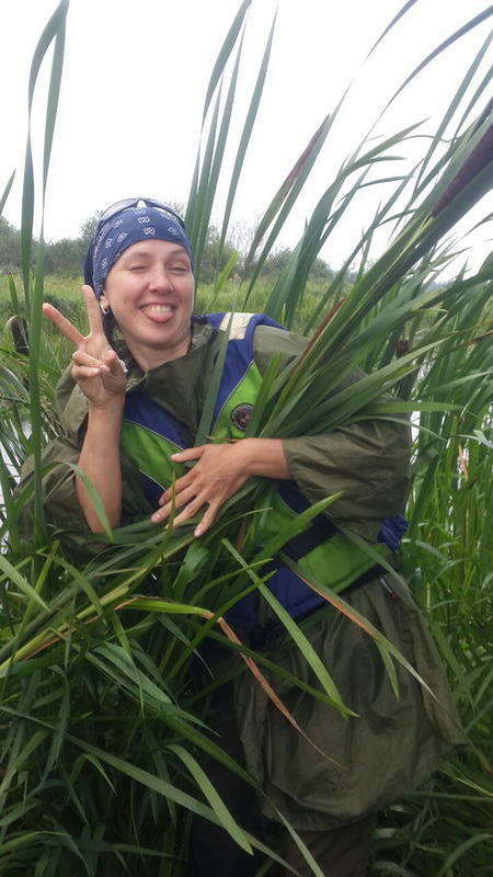 Внезапно прямо над нами собрались тучи и хлынул сильный, прямо-таки тропический ливень. Он-то и стал основной причиной еще двух потерь. Все участники бросились укрываться кто где горазд и таким образом пропали из поля зрения друг друга. Наша байдарка припарковалась в живописнейших камышах и мы с Олей, не будь дурами, сразу бросились фоткаться.