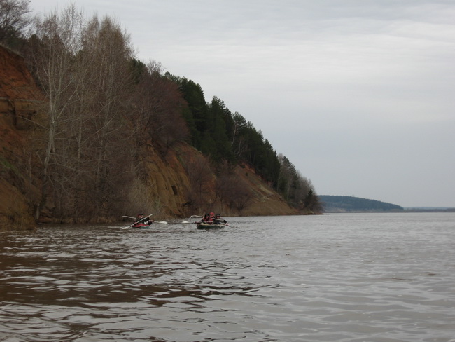 И вот мы снова на воде. Осталось совсем чуть-чуть, и я увижу те самые высокие берега из красной глины, красоту и очарование которых мне так давно уже расписывали. Ветер, бывший до последнего момента просто сильным, перешел эту грань и стал шквалистым, поднимая на Каме, в которую мы уже вышли, валы приблизительно метровой высоты. Приходилось прикладывать все явные и скрытые способности, чтобы избежать переворота, ведь до ближайшего берега в любую сторону было около 200-300 метров. И даже несмотря на то, что на всех были спасжилеты, переворачиваться и собирать потом вещи по всему фарватеру ой как не хотелось! А ветер все усиливался и усиливался. Потом резко спадал. Доходя до грани штормогого, резко менял направление. Метровые валы неистово бились о борта, заливали деку вдоль и поперек. В голове было только одно желание: «Не кильнуться».