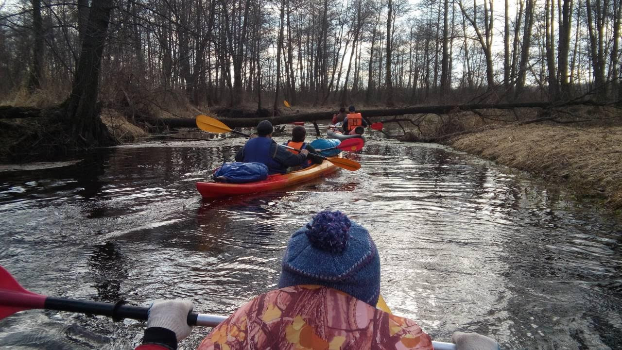 Выехали из Минска ночью 30 марта на большом бусе. По дороге заехали в район Гатово за байдарками. У места старта, деревни Старина Столинского района, были в начале утром в начале 7-ми. Упаковка имущества и сбор байдарок заняло минут 30-40. На воде были около 8-ми. Мне предстояло плыть на арендной пластиковой байдарке с Дмитрием Демешко, с которым до этого знаком не был. У Дмитрия был уже опыт сплава на байдарках, так что он был у нас капитаном а я довольствовался ролью матроса.