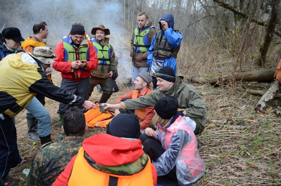 «Байдарочный поход – огромнейшее удовольствие. Подгребаешь немного, наслаждаешься природой, кушаешь шашлык». Так думалимногие, собираясь впервые на байдарочный поход девятого апреля. Все начиналось весьма комфортно: встречаешь людей разного возраста, разных профессий, кого- то встречал ранее, с кем- то знакомишься впервые. Народ сугубо доброжелательный и простой, все объединены общей тематикой и большим количеством алкоголя, который по программе необходимо было брать с собой. Немало работы проводил и Духовный Наставник.Эти факторы на старте стерли все разногласия: не важно какой ты национальности, пола, вероисповедания, сколько у тебя конечностей и в какой школе ты учился. Были же конечно и профессионалы, в дальнейшем окрещенные «молочными братьями», которые к такому событию готовились за месяц. «Молочные братья» скупили туристического оборудования на многие миллионы, вплоть до раций. Держались они до начала старта собственной компанией и в тени. Немало веселья привносили и позывные каждого участника похода (Пузо, Сосо, ВДВ, Сантехник и т.д.). Кто-то получил свое звание давно, кто был впервые, получал его по ходу мероприятия.