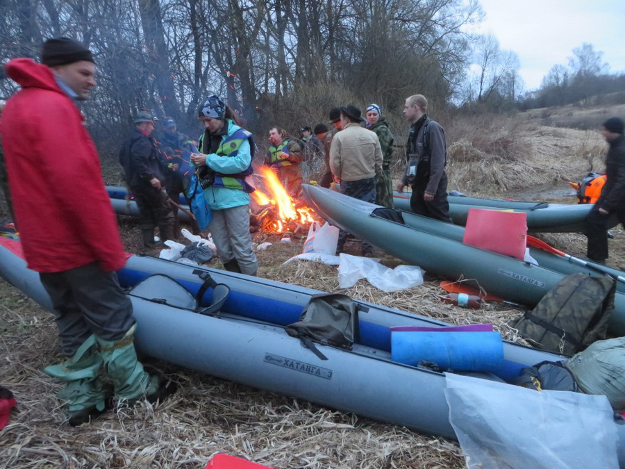 По прибытию на место спуска, автобус с кузовом, в котором находились байдарки не вписывался в разворот и все, кто смог идти в этот момент отправились исправлять это. Казалось бы, что работать физически, перенося на собственных руках пьяным лицам тяжеленный прицеп, забитый байдарками, работа весьма неприятная, однако при правильном формировании настроя даже такая неприятная работа принесла много положительных эмоций. Разгрузив автобус и не забыв никого в проходе, автобус уехал. В 5 утра на дороге без прожекторов, в кромешной тьме, в лесной глуши, с минимальной видимостью бегало порядка сорока человека и переносили вещи. Кто- то носил их с правого края моста на левый, другие же носили вещи в обратном направлении. Как только стало светать, сумбур улетучился, и народ занялся сборкой, осмотром, подготовкой байдарок, спуском на воду. Досмотреть за каждым из сорока участников не имелось возможности, поэтому были организованы три группы: темно- синяя группа, светло- синяя и группа «косички» (в каждой байдарке было по девчонке). Окраска группы зависела от количества выпитого алкоголя на воде. К 7 утра, немного протрезвев от физической работы, все было готово, байдарки загружены. «Селфи» и пару фотографий бравых ребят, кто согласился на это мероприятие, парочку шуток, выпивка и байдарки на воде…