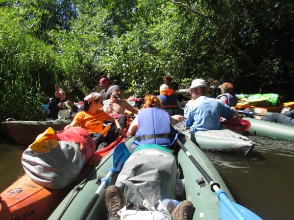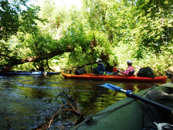 Вот так, не скучая, преодолевали мы завал за завалом. Не забывая, однако, и о традиционных стыковках с другими байдарками.