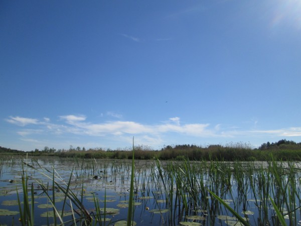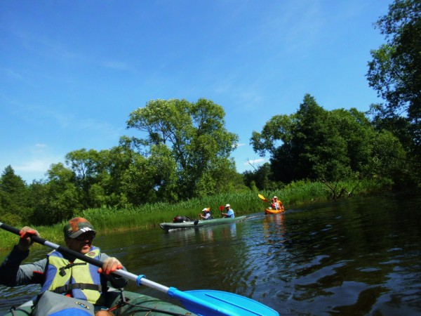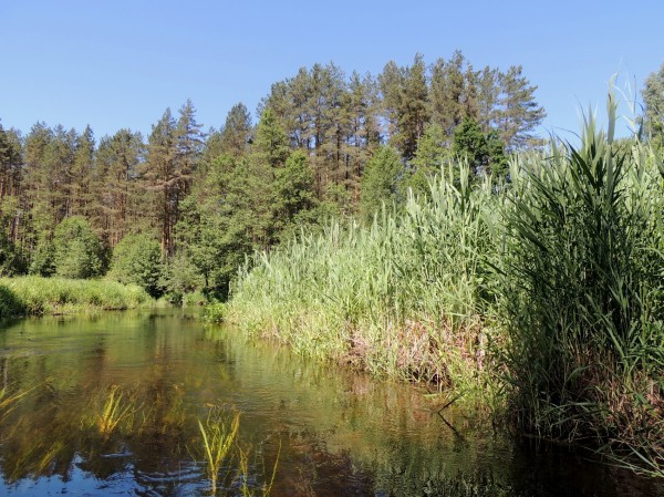 Скоро река вышла из леса, постепенно расширилась. Остались позади деревья с пышными кронами, дающими тень. Вначале с одной, а потом с обеих сторон появились заросли камышей. Оболь снова обступило болото. Синее чистое небо отражалось в воде, и река тоже казалась синей. Их разделяла яркая зеленая полоса береговой растительности. По широко петляющей реке ехали быстро.