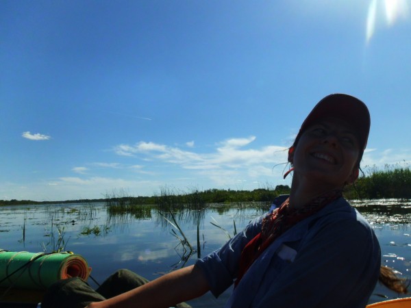 Но управлений нашим судном снова перешло к матросу. Тем временем желтый солнечный свет растворился в набежавших дружелюбных тучках. Они не грозились разразиться дождем, лишь мерно затянули голубое небо, превратив его в светло-серое. Тишину нарушало лишь журчание струйки воды, создаваемое лодкой на поворотах. Я снова гребла в уединении. Но не долго, скоро снова два весла опускались в воду из нашей байдарки.