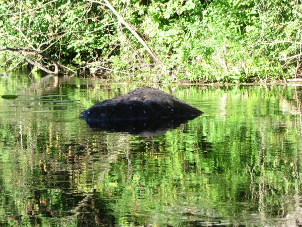 И вот, казалось, река стала свободнее. Выше, просторнее сделались своды древесных крон. Самые сложные завалы были пройдены. И вдруг, на ровном (в сравнении с пройденным сегодня) почти месте наша остроносая байдарка совершила оверкиль! Вытянувшись в байдарке, проходя под низко склонившимися над водой ветками, мы с Лёхой и с портативной колонкой вывалились из лодки в воду. Байдарка плавала кверху дном, выставив свое оранжевое брюхо. Ничего не утонуло. Лишь, искупавшись, совершенно вышла из стоя чудеснейшая колонка Баскова (к сожалению, разумеется)! Оперативно вычерпав воду из лодки, двинулись дальше.