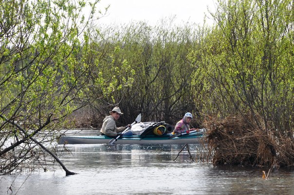30 апреля. Утро третьего дня встретило нас прохладным ветром. На весла стали в 10-20. Сегодня решено управление Щукой передать опытному экипажу Андрея Донцова. Оля и Аня соответственно перебазировались в байдарку Андрея. Но с передачей Щуки капризный рок от этого женского экипажа не ушел. Не пройдя и двух часов по воде, начались кадровые перестановки. Оли объединились в одном экипаже, а Костя ушел капитаном на лодку к Ане. Не прошло и получаса, как у Ани установилось оральное для песен настроение. Хотелось бы отметить своеобразную манеру капитанства Кости – он тщательным образом с любым из матросов изучал кусты и заросли реки. Поматросит, так сказать, и бросит...