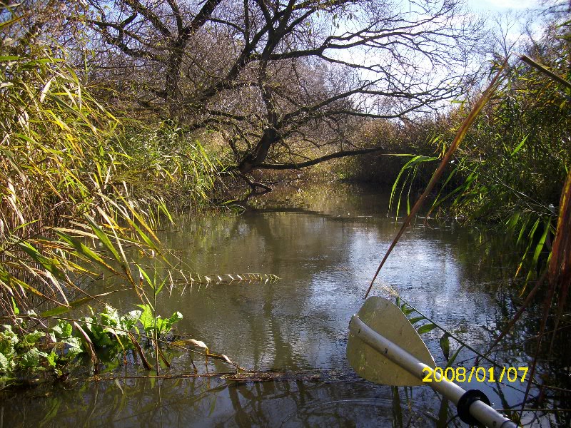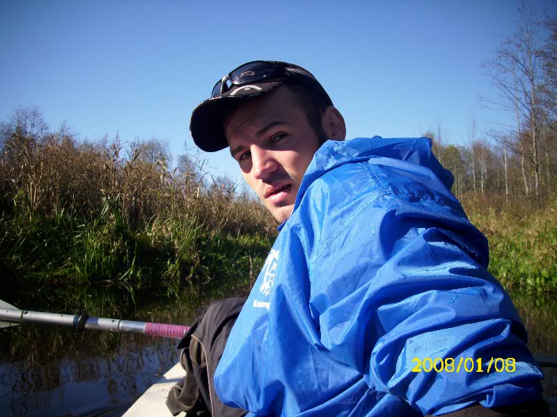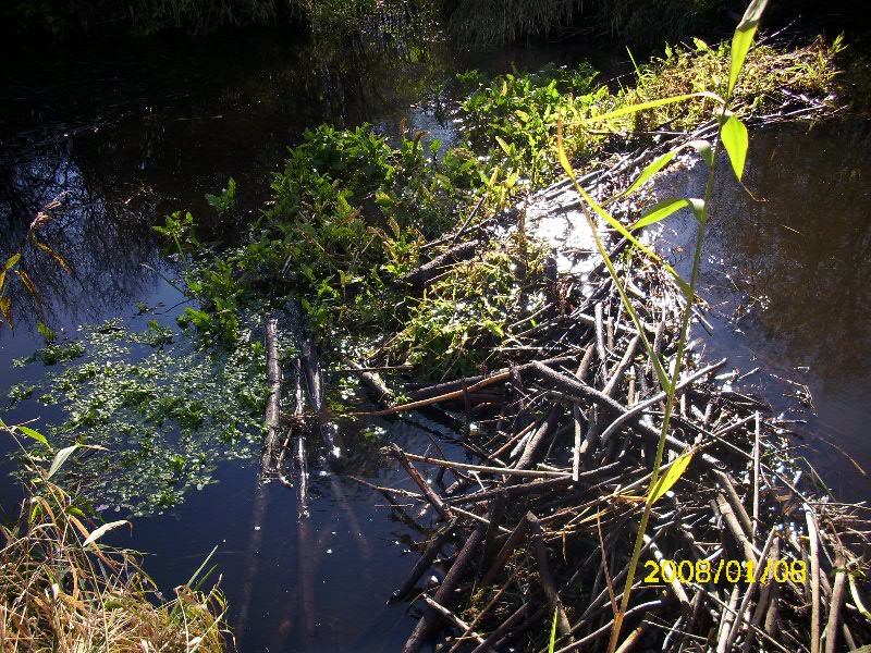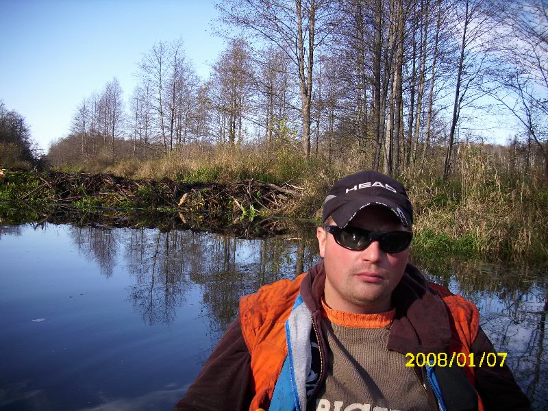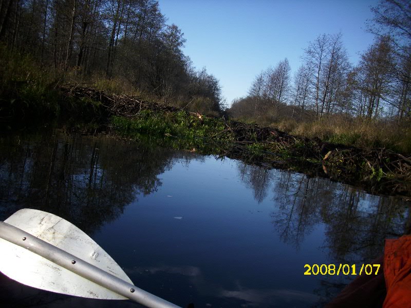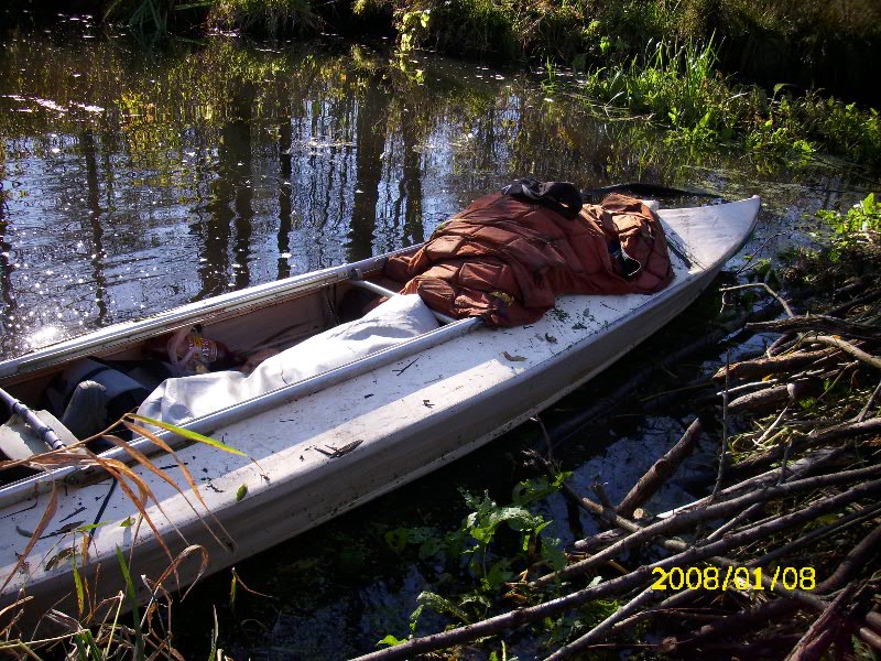 Шли на первой передаче, как в час пик на проспекте, постоянно останавливаясь, куря сигареты Лаки Страик и перестраиваясь из ряда в ряд, периодически заезжая в кюветы из камыша. На первой же развилке повернули налево, что по данным карты было по меньшей мере глупенько (кто там эти данные сразу смотрел). Так того сразу не заметив, мы оказались в системе каналов истока реки Титовка. Это совершенно своеобразная река. Она самым неожиданным образом как-то умудряется (не без рукотворных сооружений типа шлюз) начавшись из Птичи, преодолеть водораздел и влиться в чуть ниже райцентра Марьина Горка в Свислочь. Камыш вдруг сгустился, и места было ровно в ширину байдарки. Но, будучи под действием особого эликсира, снимающего не только робость, но и придающего сил, мы молотили камыш веслами, как гомсельмашевский комбайн. Иногда река расширялась, и мы, конечно же из чистого любопытства, ходили от берега к берегу, задорно ударяясь веслами. Вскоре перед нами появилась плотина, построенная местными негодяями бобрами. Т.к. обнести не было никакой возможности, пришлось переносить прямо через нее. После чего мои сапожки наполнились водой. Пошли дальше, опять плотина, снова обнесли. Дальше опять плотина: мат, смех, выпили, покурили. Вышли на берег, оглянулись мат, смех, выпили, покурили. Позвонили Глазу, который сообщил нам что, мы придурки, и нам надо разворачиваться и возвращаться обратно – так дешевле всего будет. Осмотрелись еще раз. Среди нор, кочек и всякой белиберды было найдено удовлетворительное место для палатки. Было около 15:00. Все, привал два часа сна, а потом питание и т.д. Так и решили.