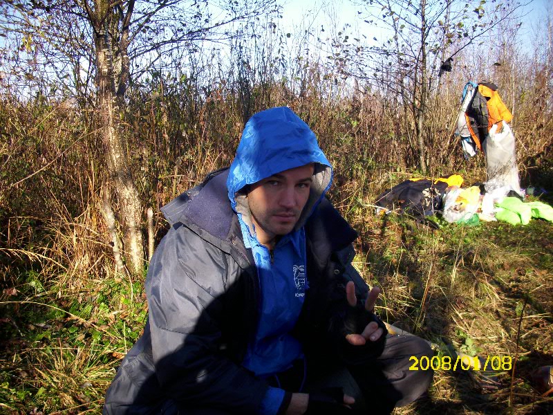 Рано – рано утром Паша высадил нас на берегу Птичи около деревни Сраные Русаковичи. Было еще темно, по реке стелился туман. Решили до того как рассветет не предпринимать никаких действий. Когда пришло время сбора, мы высыпали составные части на землю и начался неудержимый смех. Я уже немного подзабыл методику сборки лодкии, глядя на груду железа был сильно растерян. Шурик позвонил Наташе