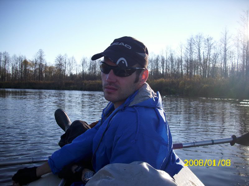 Двинулись дальше. По берегам появлялись лесистые участки, но река все как-то избегала их. Опять песни, разговоры, «минералка». Время неумолимо шло к закату. Река расширилась, рыбачков стало больше, но места стоянки как-то все не было. И вдруг за поворотом мы обнаружили, что весь правый берег лес. Радости нашей не было предела, т.к. перспектива замерзнуть ночью в байдарке, идя с фонарями была более чем реальна. На месте чалки оказалась поляна со следами цивилизации. Шурик остался рад разбросанным вокруг бутылкам, так как он был штатный костропал и подходил к этому вопросу практично. Лагерь разбили в ельничке. Выпивали, созванивались с Наташей, ходили за дровами и вообще были довольны проведенным днем.