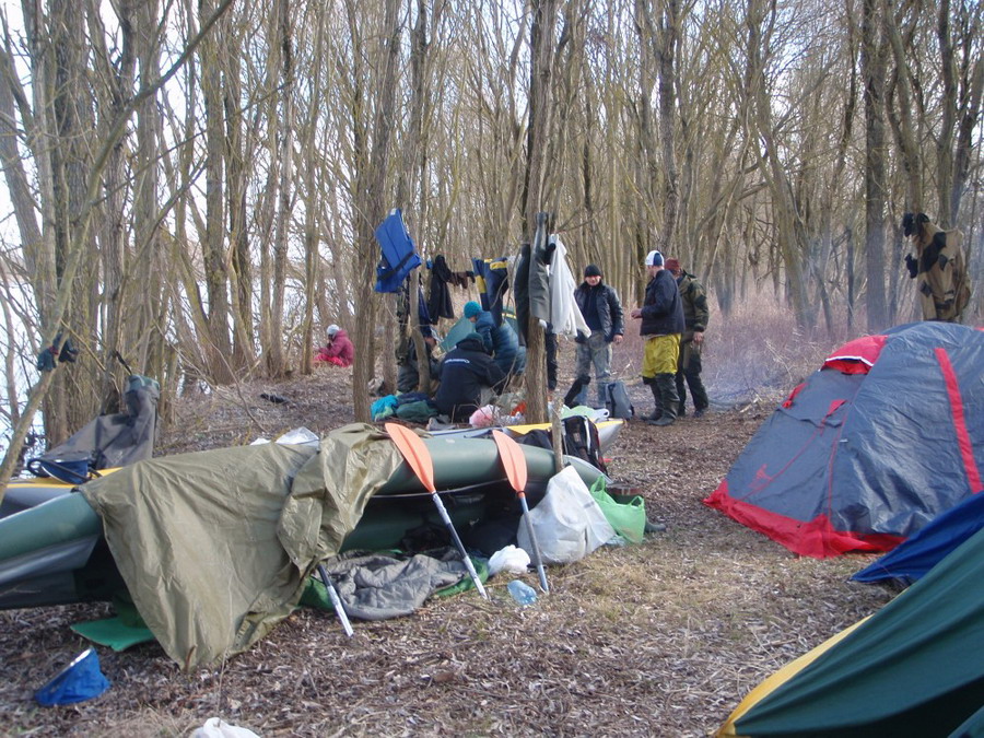Неровные и коренастые. Еще не сгнивший ковер прошлогодних листьев. Было тихо, по-утреннему гулко, влажно. Земля казалась теплой и жирной. До Украины оставалось к югу кусочек территории менее пяти километров. Несмотря на недосып, все участники похода находились в веселом расположении духа. Для бодрости между делом выпивали и закусывали, благо байдарки марки Хатанга были очень легки в сборке. Вздыхали насосы. Из скрученных резиновых рулонов восставали лодки. Погода шепчет и все идет изумительно! Глаз был в хорошем расположении духа и хохотал как Вася Дробышевский.